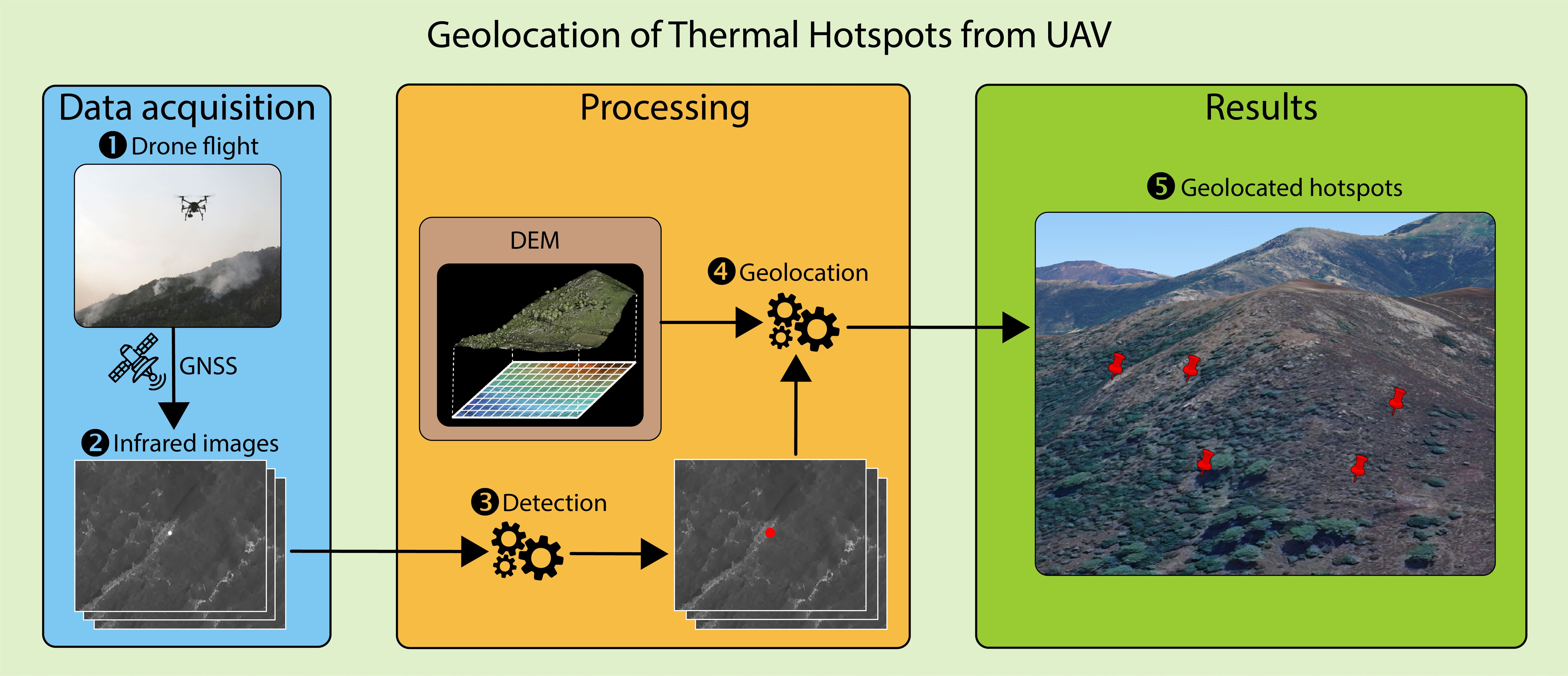 - A novel DEM-based algorithm is proposed for geolocating thermal hotspots detected by UAVs over both flat and mountainous terrain.