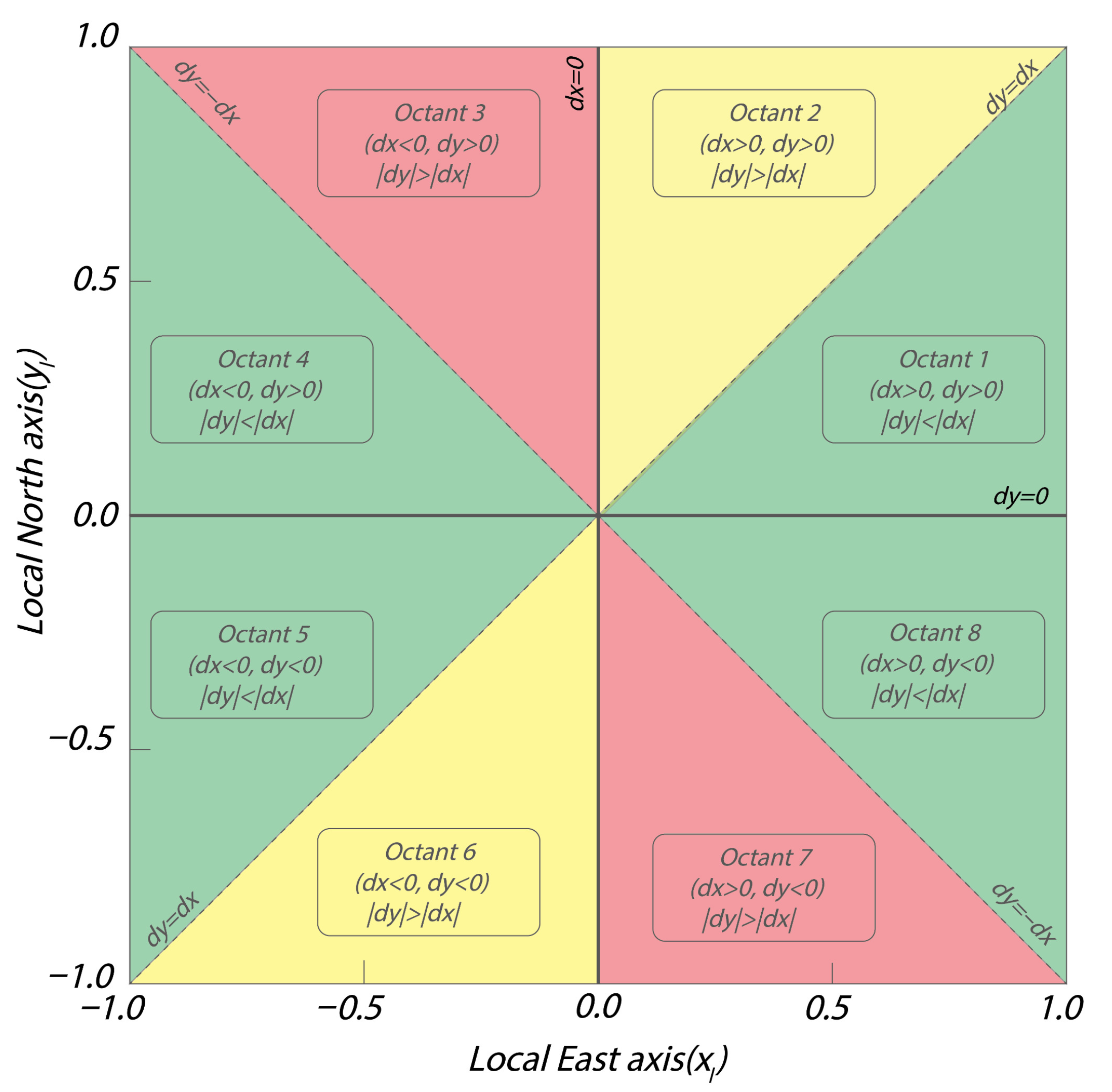 - Case 1—Same sign (; octants 2 and 6).