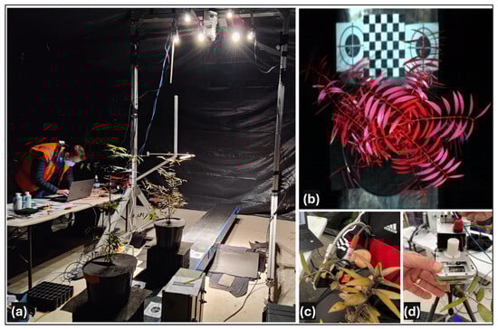 (a) Experimental setup for the hyperspectral imaging of kauri seedlings under a controlled-environment, (b) false-colour image derived from canopy-level acquisition, (c) leaf-level hyperspectral data collection, and (d) gas exchange measurement using the GFS-3000 system.