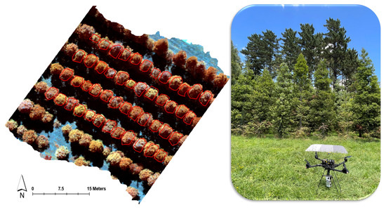False-colour composite derived from hyperspectral imagery of the kauri stand, with red polygons delineating the individual tree canopies included in this study (left) and Headwall hyperspectral sensor mounted on the Freefly Alta-X drone during field data acquisition, with juvenile kauri trees visible in the immediate background (right).