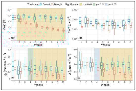 Temporal variation in (a) soil volumetric water content (VWC), (b) equivalent water thickness (EWT), (c) stomatal conductance (gs), and (d) assimilation rate (A) by treatments from week 1 to week 10 (replotted from Felix et al., 2025 [20]). Boxplots that are shaded with blue, green, and yellow denote statistically significant differences of p < 0.05, p < 0.01, and p < 0.001, respectively. Whiskers indicate ± 1.5 × the interquartile range.