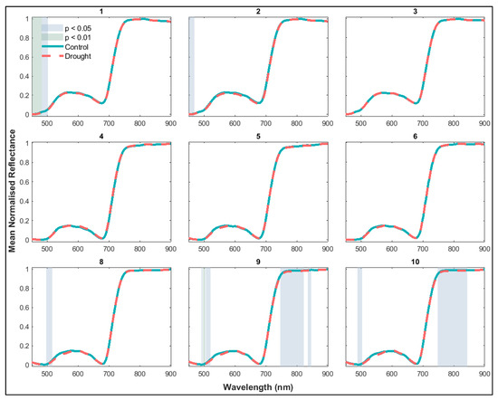 Spectral variation between treatments over the course of the 10-week experiment. Mean normalised reflectance at wavelengths with significant differences of p < 0.05 and p < 0.01 are shaded, respectively, using blue and green. The spectral profile for week 7 closely resembled that of week 6 and is therefore omitted for conciseness.