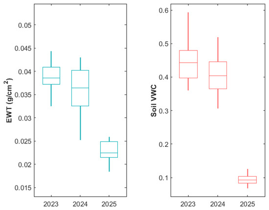 Variation in (left) equivalent water thickness (EWT) and (right) soil volumetric water content (VWC) of juvenile kauri trees, measured during March 2023, 2024, and 2025. Boxplots indicate the median (horizontal line), interquartile range (boxes), and whiskers represent variability outside the upper and lower quartiles.