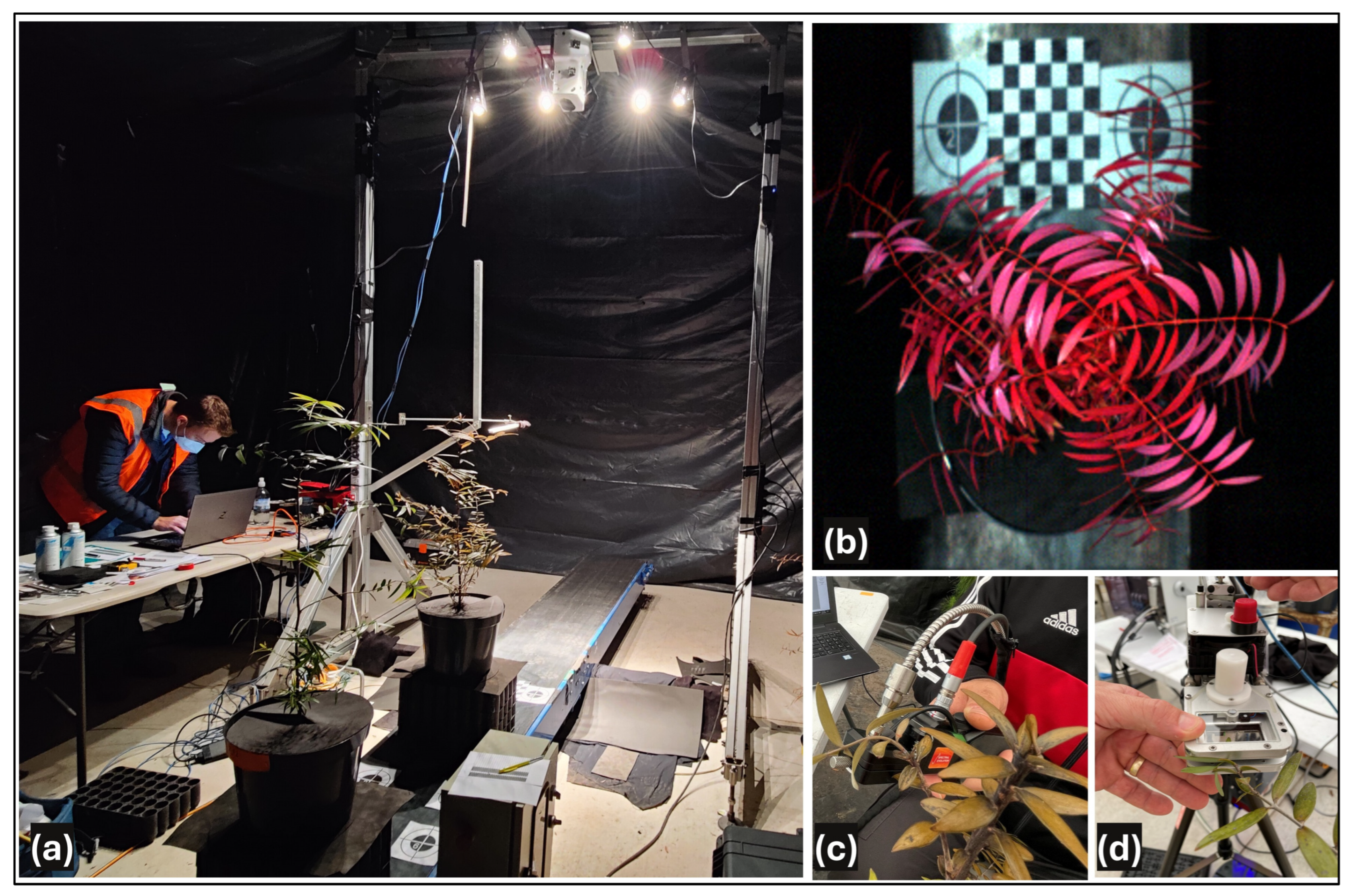 Figure 1. (a) Experimental setup for the hyperspectral imaging of kauri seedlings under a controlled-environment, (b) false-colour image derived from canopy-level acquisition, (c) leaf-level hyperspectral data collection, and (d) gas exchange measurement using the GFS-3000 system.