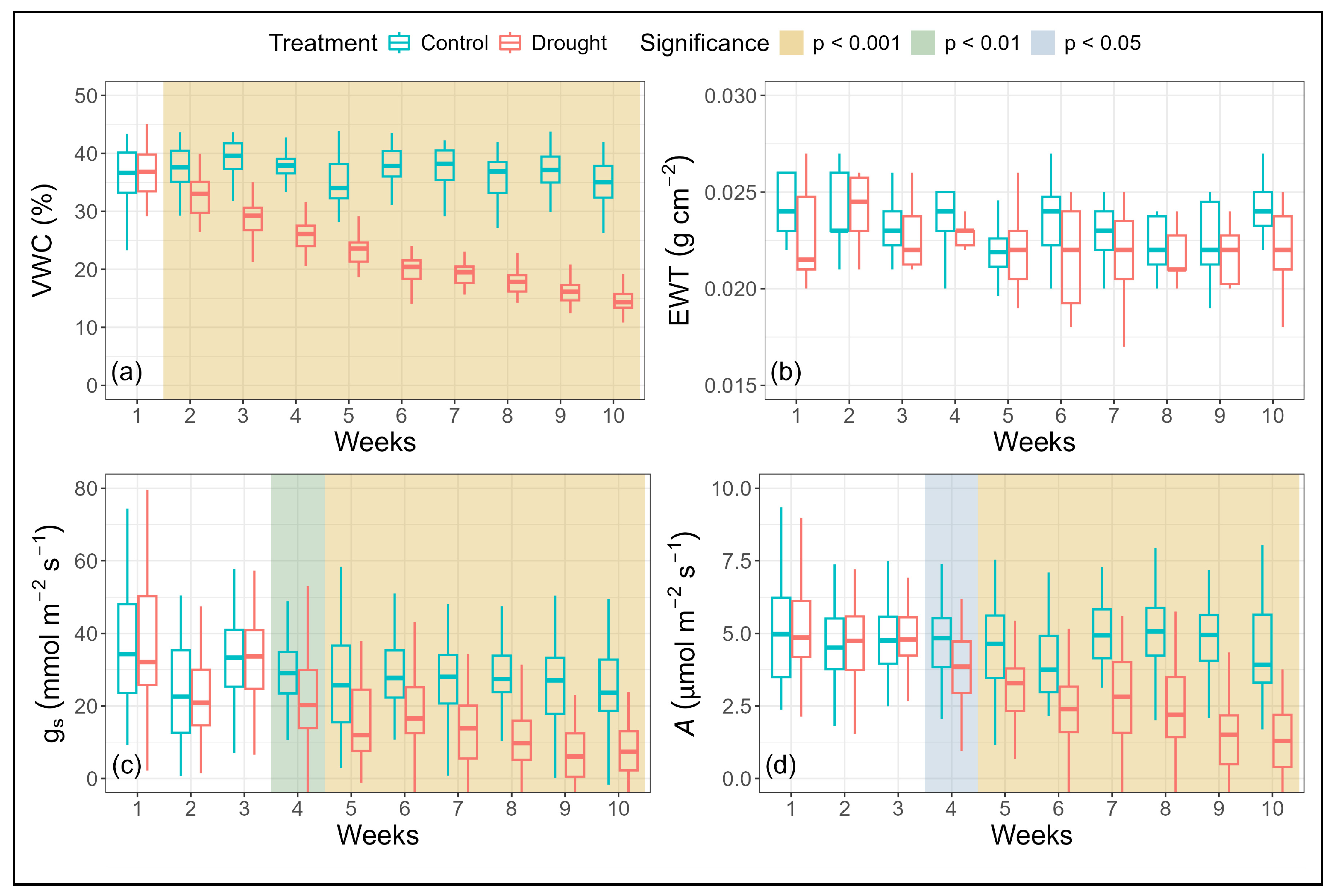 Figure 3. Temporal variation in (a) soil volumetric water content (VWC), (b) equivalent water thickness (EWT), (c) stomatal conductance (gs), and (d) assimilation rate (A) by treatments from week 1 to week 10 (replotted from Felix et al., 2025 [20]). Boxplots that are shaded with blue, green, and yellow denote statistically significant differences of p < 0.05, p < 0.01, and p < 0.001, respectively. Whiskers indicate ± 1.5 × the interquartile range.