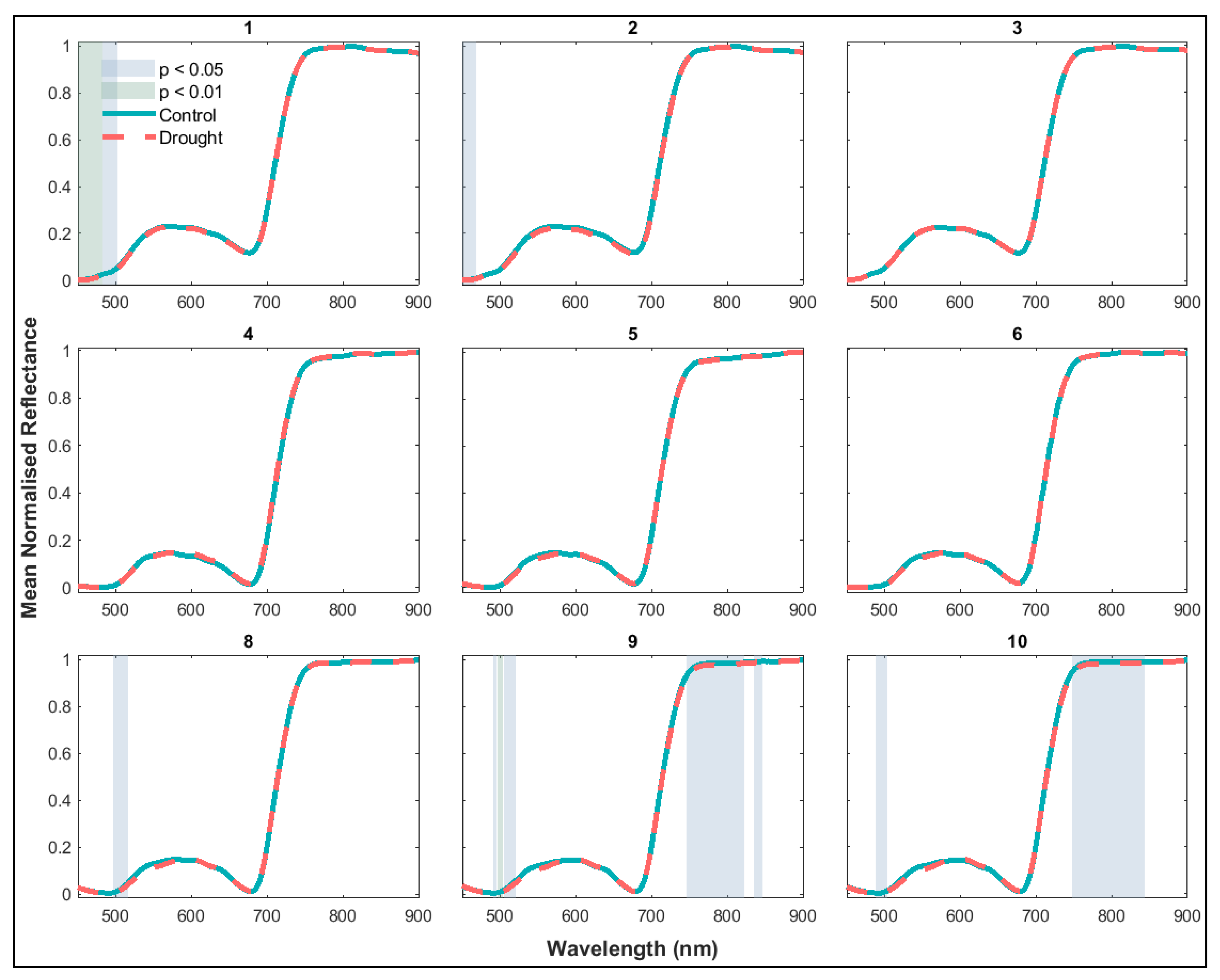 Figure 4. Spectral variation between treatments over the course of the 10-week experiment. Mean normalised reflectance at wavelengths with significant differences of p < 0.05 and p < 0.01 are shaded, respectively, using blue and green. The spectral profile for week 7 closely resembled that of week 6 and is therefore omitted for conciseness.