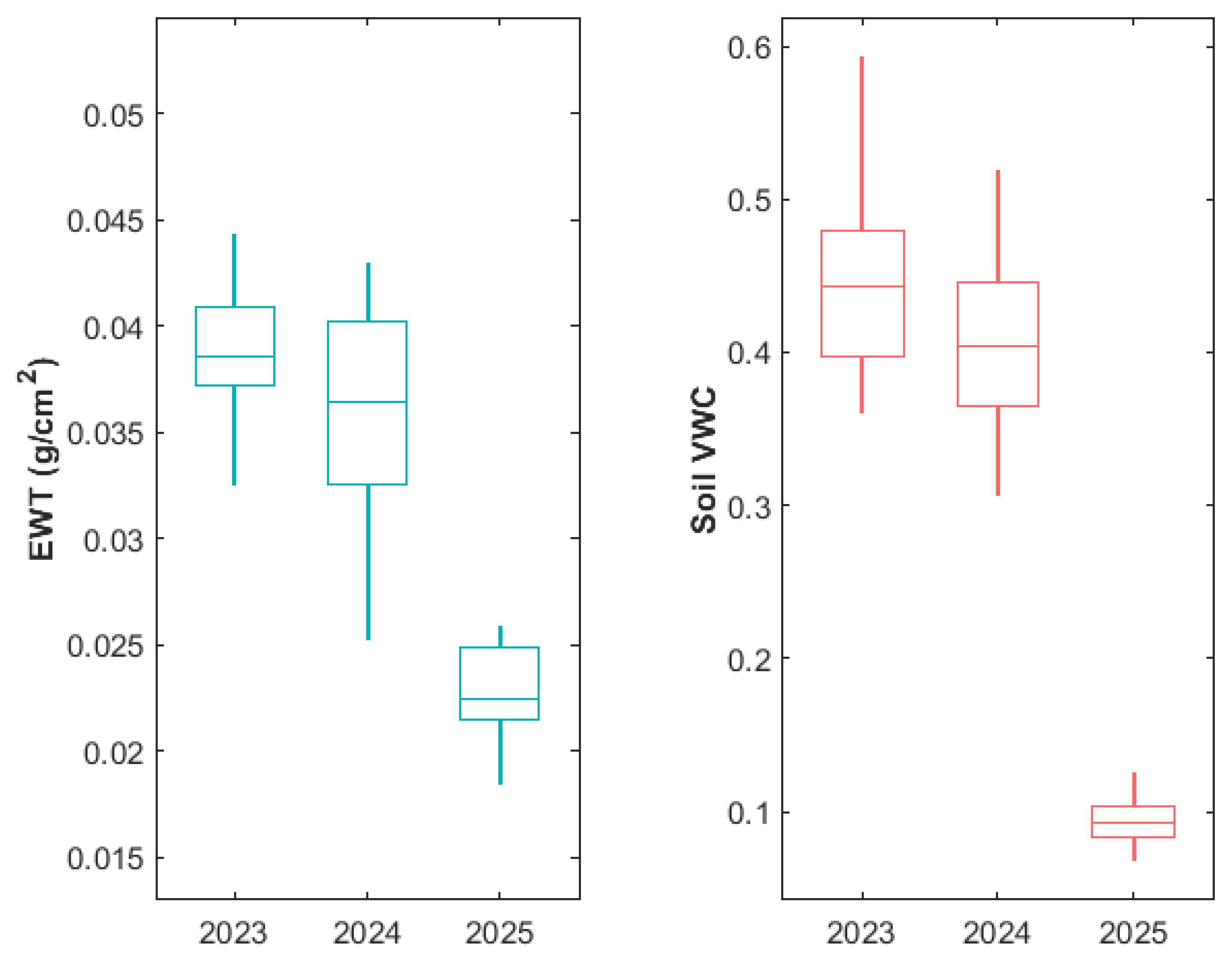 Figure 5. Variation in (left) equivalent water thickness (EWT) and (right) soil volumetric water content (VWC) of juvenile kauri trees, measured during March 2023, 2024, and 2025. Boxplots indicate the median (horizontal line), interquartile range (boxes), and whiskers represent variability outside the upper and lower quartiles.