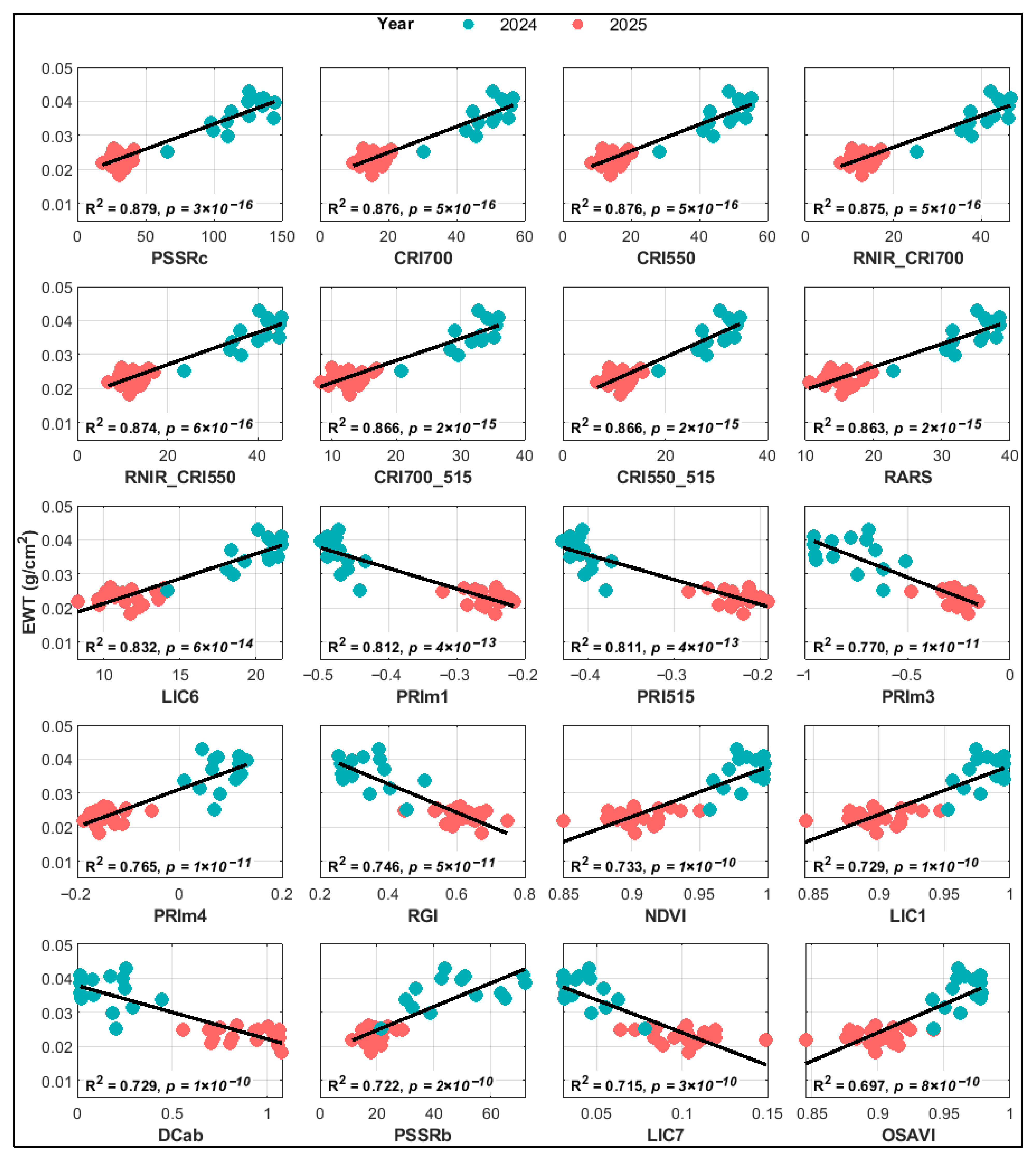 Figure 7. Correlation plots between equivalent water thickness (EWT) and the 20 NBHIs with the highest R2. Measurements were made during March 2024 (teal circles) and March 2025 (red circles). The plots are arranged in descending order of R2, from top left to bottom right. The displayed fitted lines are linear.