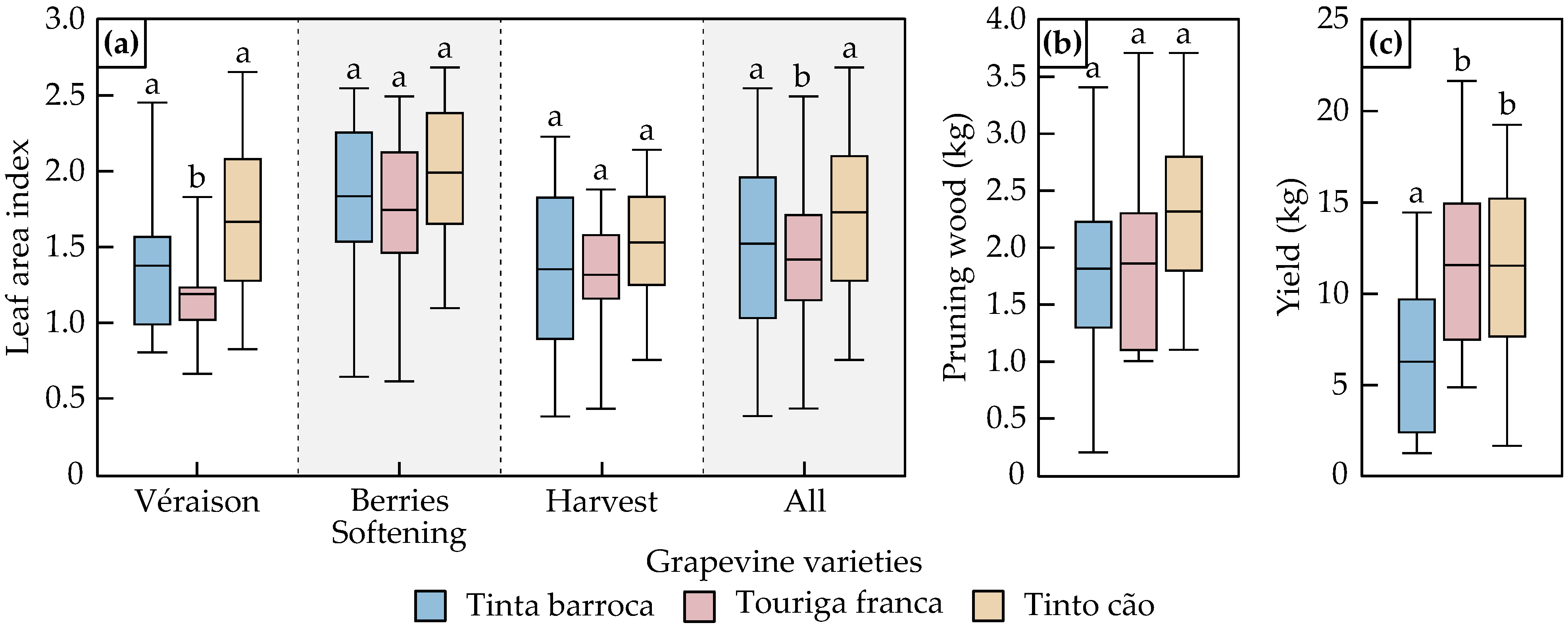 | Grapevine Variety | Mean LAI | Pruning Wood Biomass (kg) | Yield (kg) | ||||||