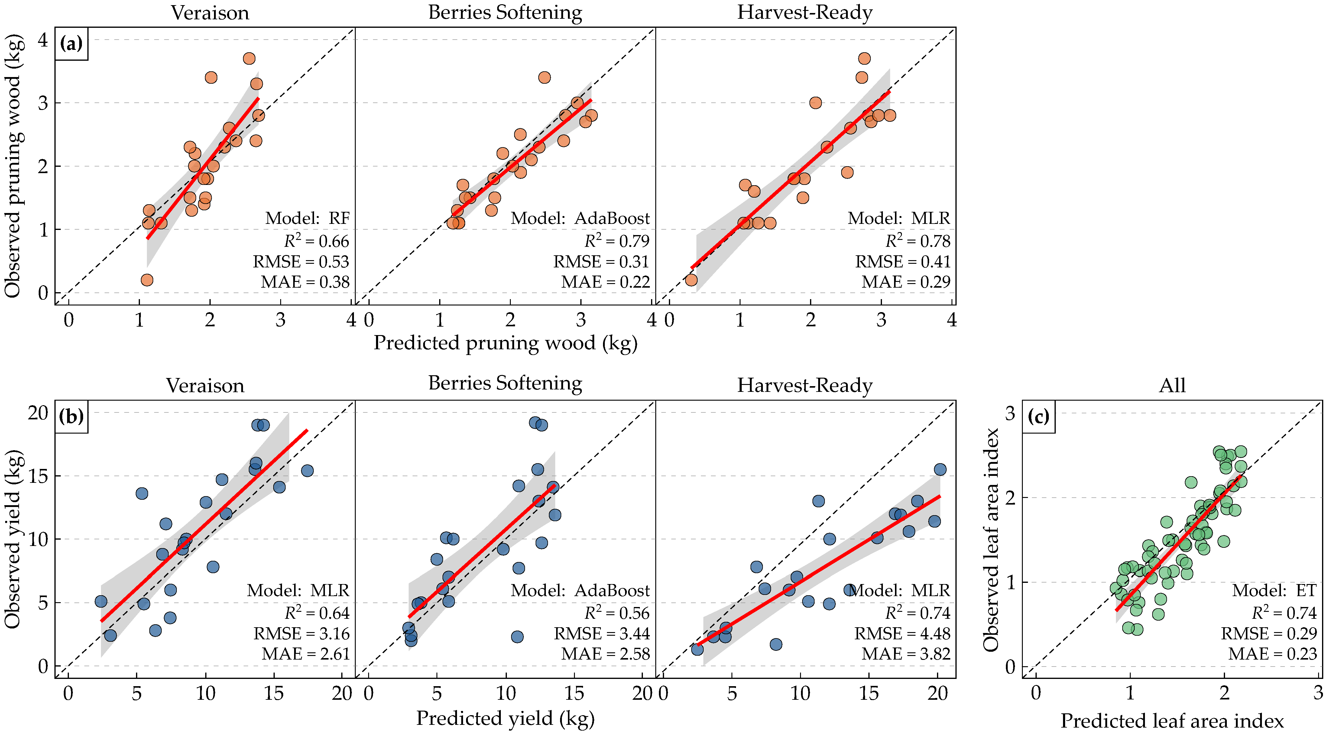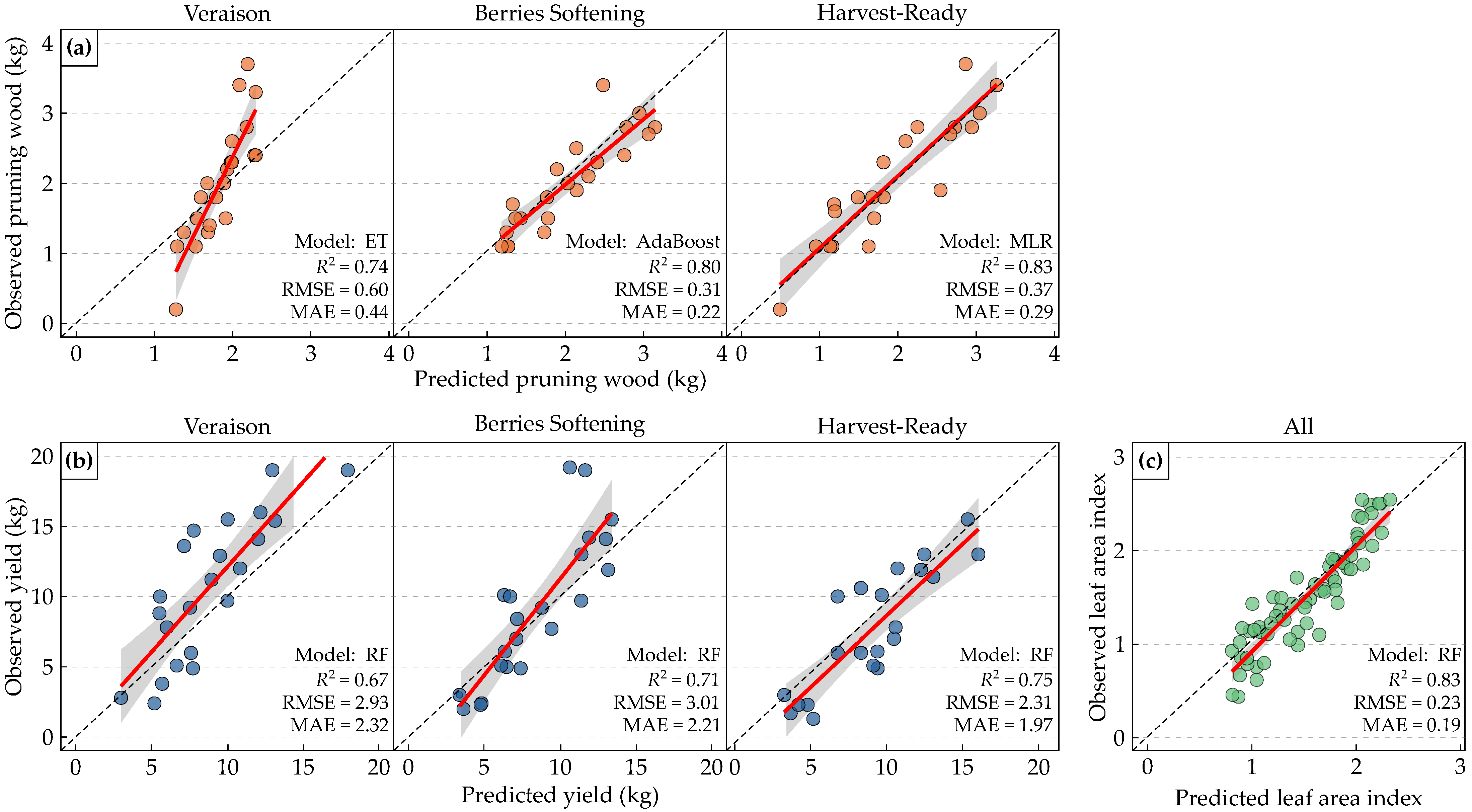 - UAV multispectral data combined with machine learning enabled the estimation of grapevine biophysical parameters, including LAI, pruning wood biomass, and yield.