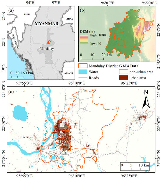 As Myanmar’s second-largest city, Mandalay serves as a vital economic, cultural, and transportation hub in the country’s Central Dry Zone [48]. According to the 2014 national census, it had a population of approximately 1.7 million, making it one of the most densely populated urban centers in Myanmar [49]. In terms of administrative division, the Mandalay region comprises seven townships: Aungmyetharzan, Chanayetharzan, Mahaaungmye, Chanmyatharzi, Pyigyidagun, Amarapura and Patheingyi. The district exhibits a concentrated pattern of building distribution, as illustrated in the map depicting the urban area (Figure 1).