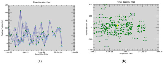 Following the small baseline approach, we set spatial and temporal baseline thresholds to generate differential interferograms. To ensure effective connectivity among all SAR images, we set the maximum normal baseline to 120 m and the maximum temporal baseline to 60 days. The resulting time-position plot and time-baseline plot are shown in Figure 2, where green represents valid interferometric pairs. In the interferometric processing, the Minimum Cost Flow algorithm was selected as the phase unwrapping method, with the unwrapping decomposition level set to 1 and the coherence threshold for unwrapping set to 0.3. The coherence threshold of 0.3 was selected based on preliminary SBAS-InSAR tests using 2022–2024 Sentinel-1 data. While lower thresholds, like 0.2, reduced voids, they also introduced unreliable estimates over water bodies due to low temporal coherence. A threshold of 0.3 better preserves signals from urban infrastructure—our primary focus—while effectively excluding non-reflective or unstable surfaces. The Goldstein filter was applied for interferogram filtering to suppress phase noise while preserving fringe details. Atmospheric disturbances were corrected using Generic Atmospheric Correction Online Service (GACOS) [52,53,54]. Additionally, we reduced orbital phase errors by applying Precise Orbit Ephemerides (POD) and eliminated phase errors using SRTM DEM data. The Height Precision Threshold and Velocity Precision Threshold were set to 10 and 8, respectively, with the Product Temporal Coherence Threshold configured to 0.15. The unwrapped phase was then geocoded to the WGS84 coordinate system to generate the final deformation products [55,56,57].