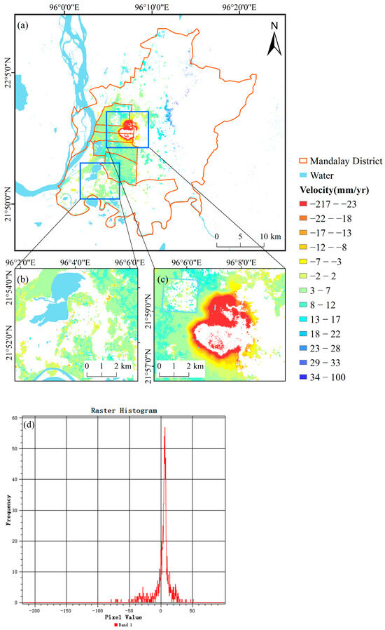 Figure 5 displays the distribution of surface deformation rates across the main urban areas of Mandalay City from January 2022 to March 2025, based on data from about 330,000 sample points obtained through SBAS-InSAR. The area shows a maximum difference in deformation rates of up to 119 mm/year, with the fastest subsidence and uplift rates being −217 mm/yr and 99 mm/yr, respectively. The map reveals that subsidence is mainly concentrated in the Mandalay district, especially in the eastern part, where it is most noticeable. An interesting observation is the ring-like pattern of this subsidence, mostly appearing around the outer edges of the monitored area.