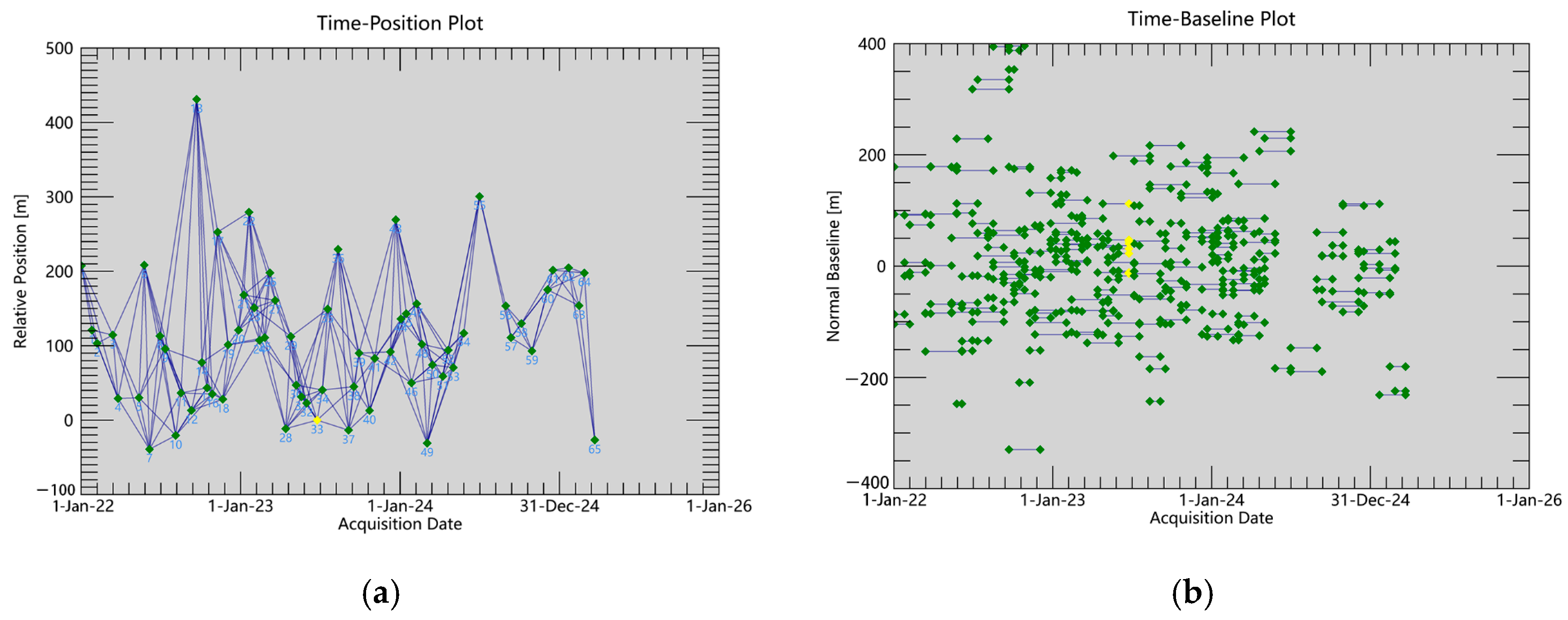 - Yu, Z.; Zhang, G.; Huang, G.; Cheng, C.; Zhang, Z.; Zhang, C. SSBAS-InSAR: A Spatially Constrained Small Baseline Subset InSAR Technique for Refined Time-Series Deformation Monitoring. Remote Sens. 2024, 16, 3515. [Google Scholar] [CrossRef]