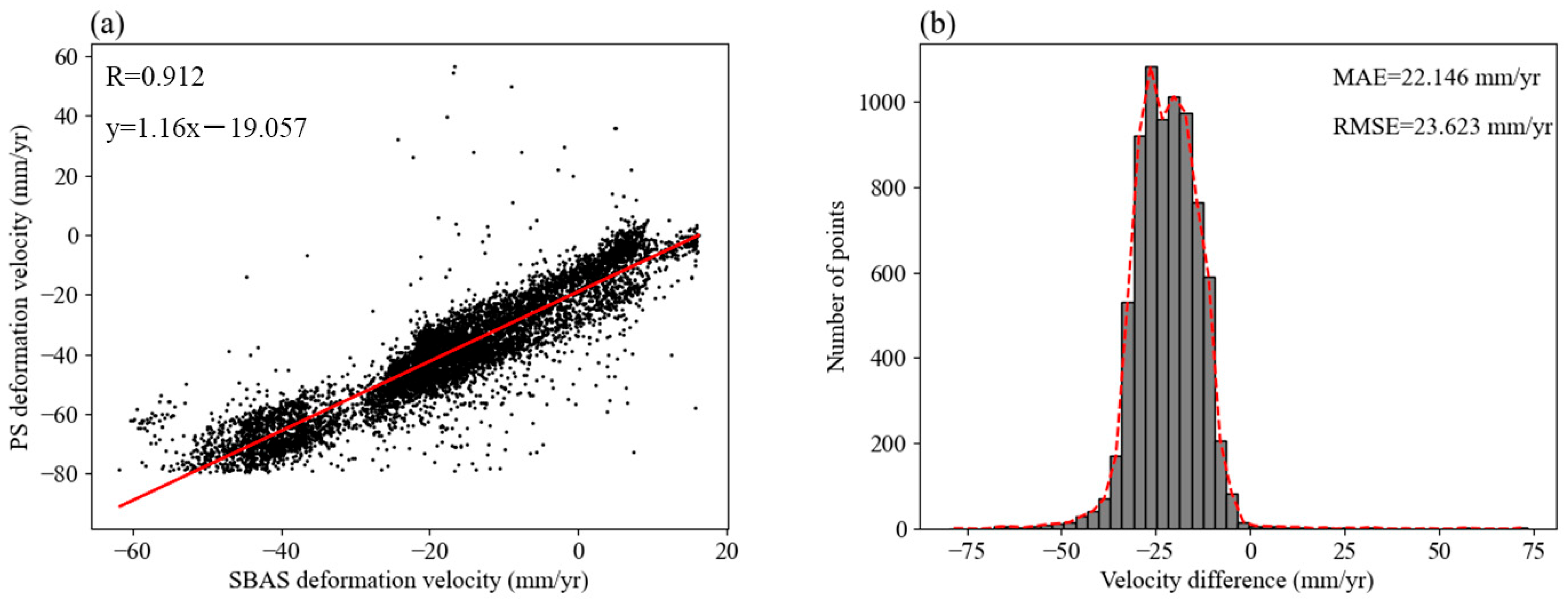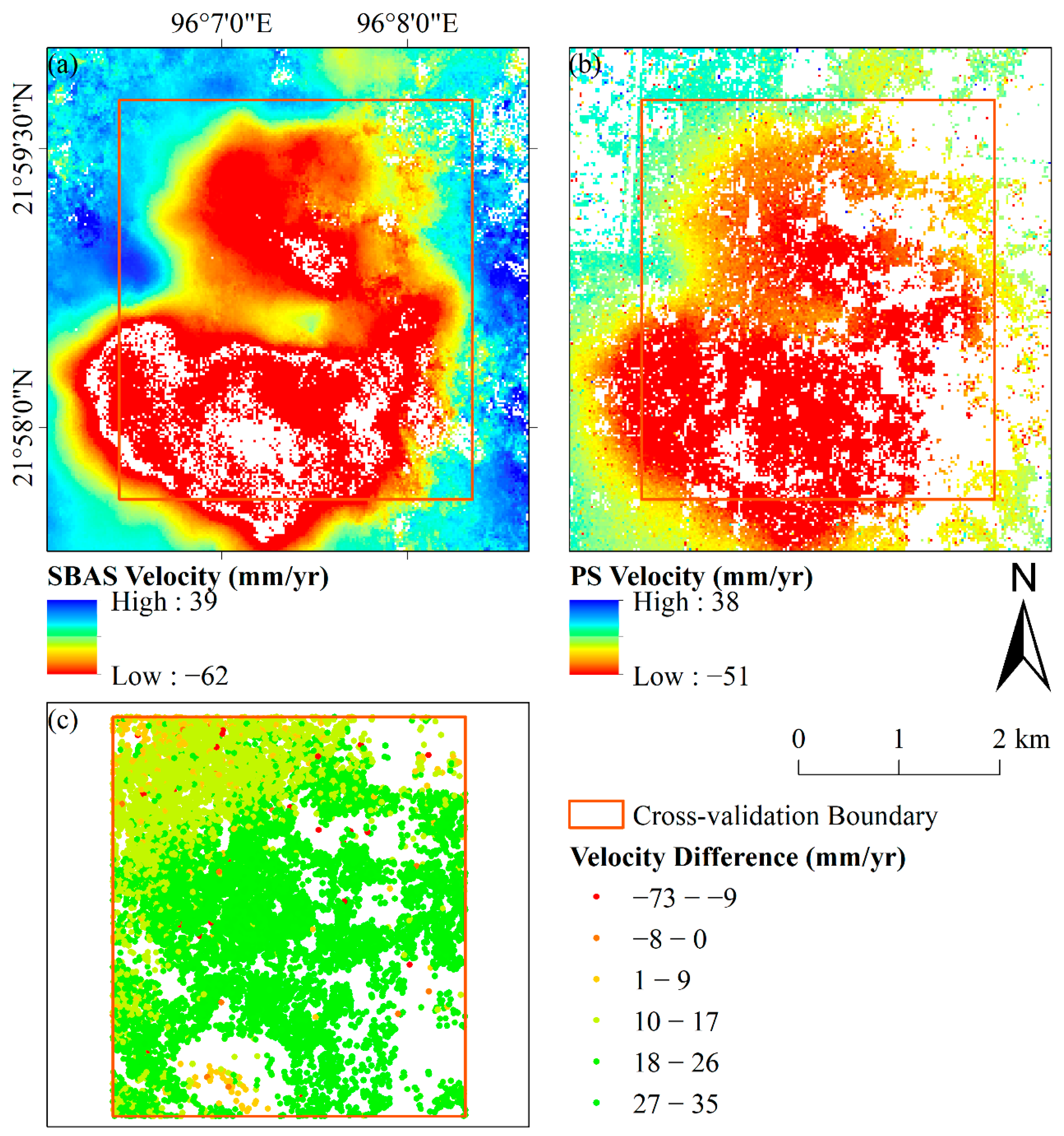 - Reference point stability: If the selected reference pixel has undetected motion, it introduces a constant bias across the entire displacement field. Differences in reference point selection between PS-InSAR and SBAS-InSAR can thus lead to an overall offset in the estimated velocities.