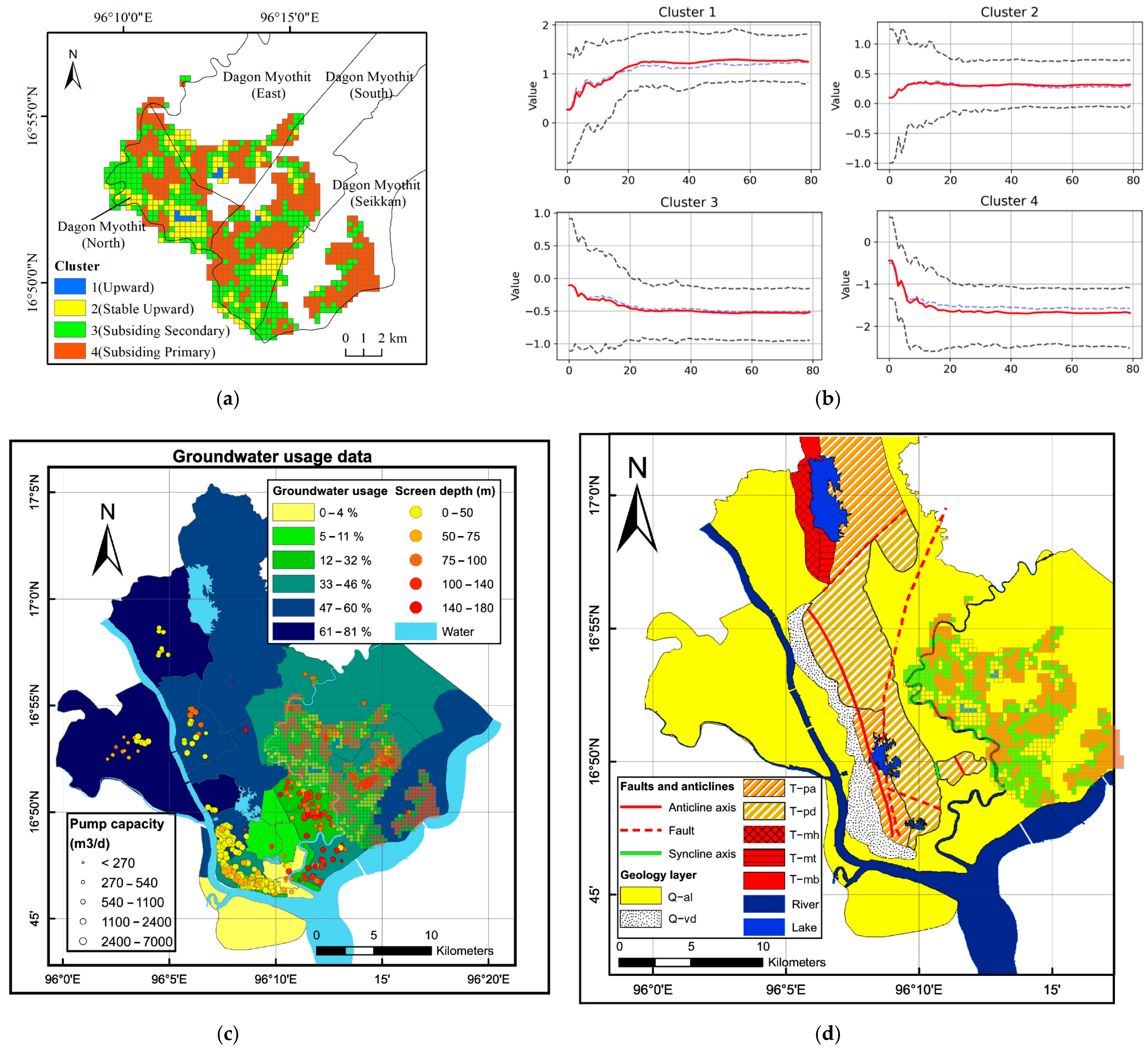 - Conducting a comprehensive analysis of the spatial distribution and temporal evolution characteristics of clustering results by integrating human activity factors and conceptual models based on geological and groundwater conditions to reveal the potential driving mechanisms of land subsidence.