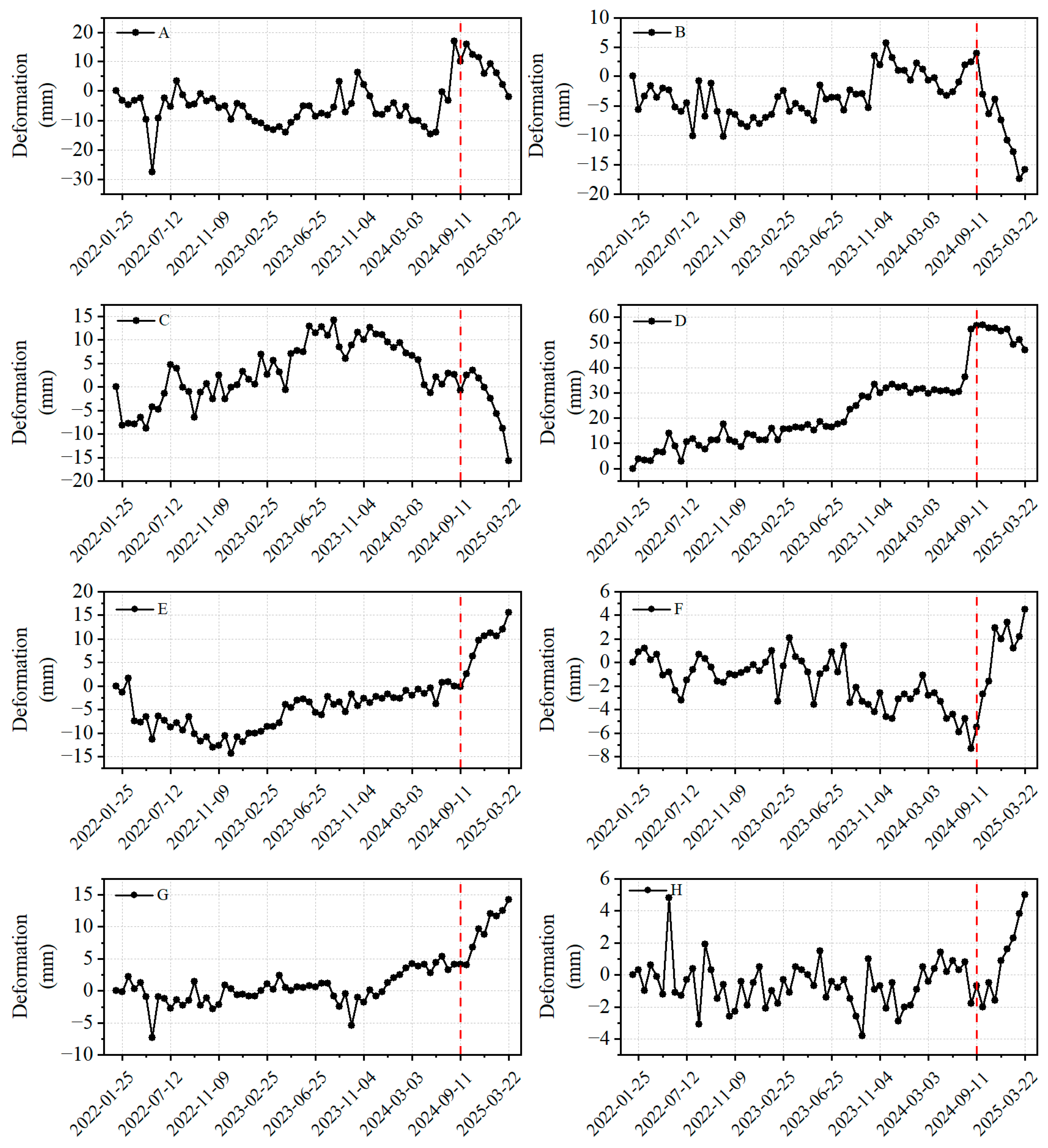 - Points E–H: exhibited minor fluctuations during the long-term phase but clear uplift in the recent phase.