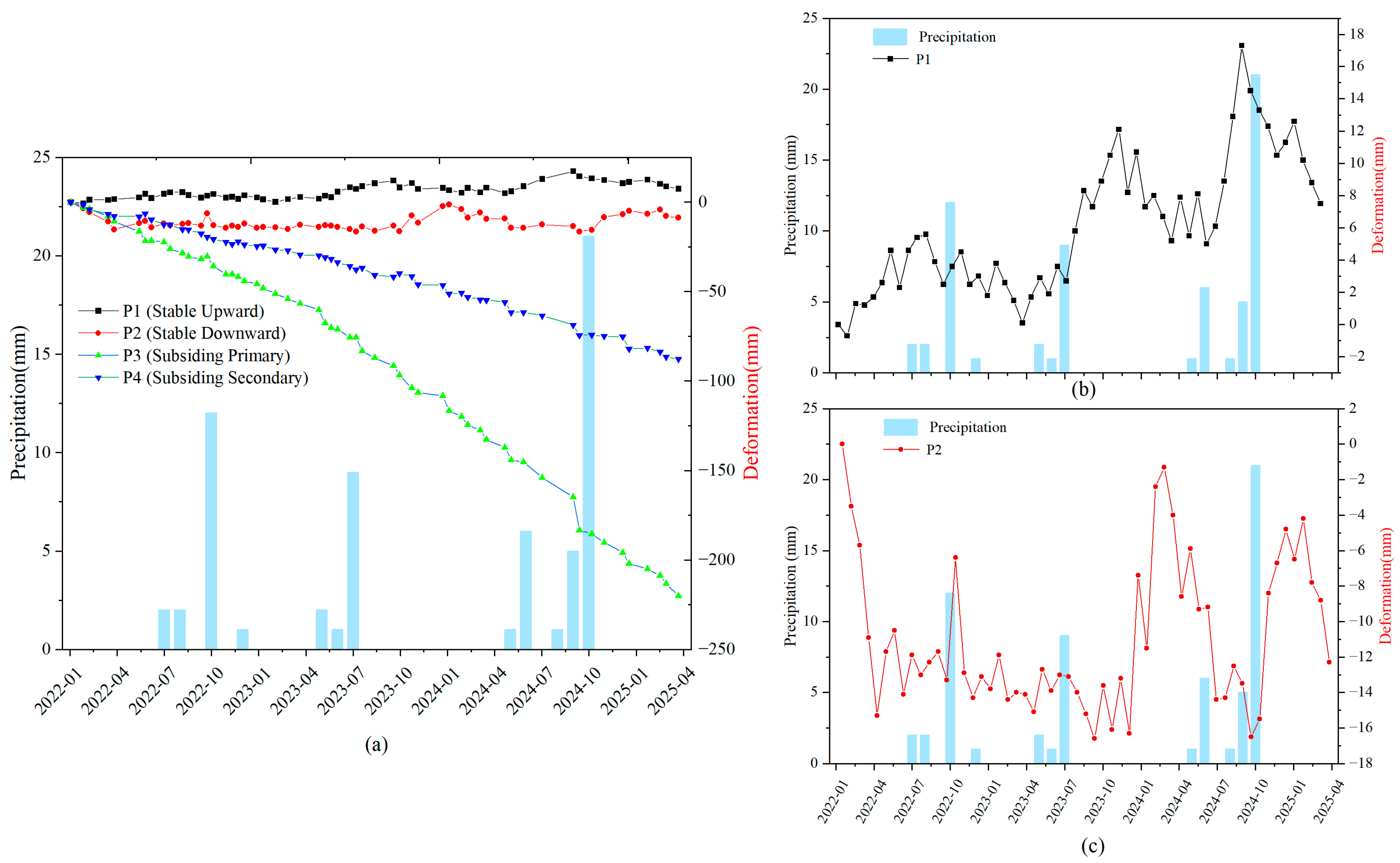 - Points A–D (located in pre-seismic subsidence areas): points A and B showed brief uplift before the recent phase, followed by continuous subsidence; Point C transitioned from stability to subsidence; Point D experienced slow uplift during the long-term phase, followed by a strong uplift event, and then transitioned to subsidence.