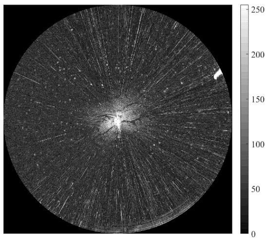 Field data collection was performed on 21 July 2010, utilizing a computer-integrated X-band shipborne radar system. The acquired experimental dataset is presented in Figure 1, while detailed equipment specifications are summarized in Table 1. The selection of Sperry Marine X-band radar was based on its high frequency and short wavelength, which offered exceptional resolution and accuracy for precise target detection. The system determined target distance, azimuth, and velocity by analyzing the echoes of transmitted electromagnetic waves. During collection, the rotating, horizontally polarized antenna acquired clutter signals at a rate of 28–45 images per minute. To ensure complete capture of oil film targets with high-resolution edge features, data acquisition was conducted at a range of 0.75 nautical miles (nm). The resulting images had a resolution of 1024 × 1024 pixels, and the substance under study was crude oil.