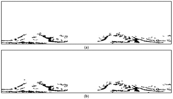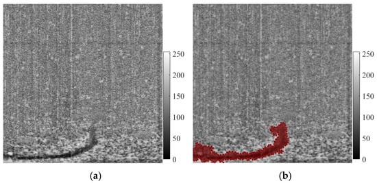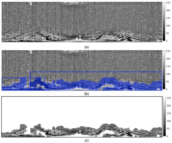 Given that oil films exhibit relatively dark image characteristics, high-intensity targets (particularly those within oil film regions) may interfere with target identification accuracy. So, a dual-threshold method was employed for high-intensity target extraction. And, a median filter was employed to eliminate residual noise, as shown in Figure 3c.