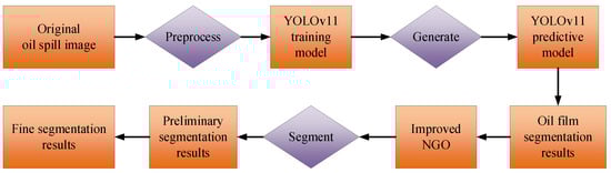 This framework capitalized on the respective strengths of its components. The real-time requirement for marine oil spill monitoring was ensured by the coarse segmentation achieved by the YOLOv11 model. Meanwhile, the Precision of localized segmentation was enhanced through an improved NGO algorithm. By synergistically integrating these modules, a balanced solution was provided for oil spill detection in complex marine environments. This effectively coordinates operational efficiency and segmentation accuracy. The entire experimental process is shown in Figure 7.