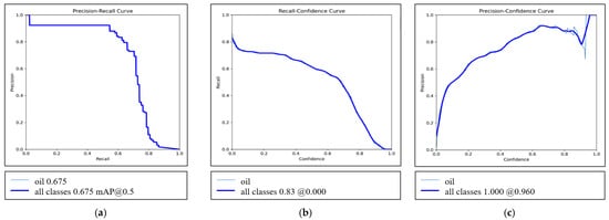 Due to the limited sample size, the test set may further reduce the training data and affect model performance. Therefore, the training set and validation set were divided into 8:2, with 976 and 244 images, respectively. The images were set to 640, the epochs were set to 300, the batch was set to 16, and the model training outcomes were visualized in Figure 8. The oil spill detection performance was evaluated through three analytical curves: PRC, RCC, and PCC. As shown in the PRC, the mAP@0.5 of the model for oil spill targets (oil class) and all classes reached 0.675. This indicator was at a reasonable level in similar oil spill segmentation tasks. It is shown that the model can effectively balance the accuracy and completeness of object detection. The RCC results indicated that when the confidence threshold was 0.000, the recall rate of oil spills and all category targets could reach 0.83. It meant that the model had recognition sensitivity for oil spill areas and could capture most potential oil spill targets even in complex backgrounds, significantly reducing the risk of missed detections. The PCC further showed that when the confidence threshold was raised to 0.960, the detection accuracy of the model for oil spills and all types of targets reached 1.00. It confirmed that the model can accurately distinguish oil spills from background and other interfering targets when outputting with high confidence, demonstrating target segmentation specificity. Based on the above curve analysis, it can be concluded that the model exhibited good comprehensive performance in oil spill instance segmentation tasks. The training model can achieve high recall rates in low confidence scenarios and cover potential oil spill areas. It can also maintain extremely high accuracy in high-confidence scenarios to ensure the reliability of segmentation results. So, the core requirements of “reducing missed detections” and “controlling false alarms” were effectively balanced in oil spill segmentation tasks.