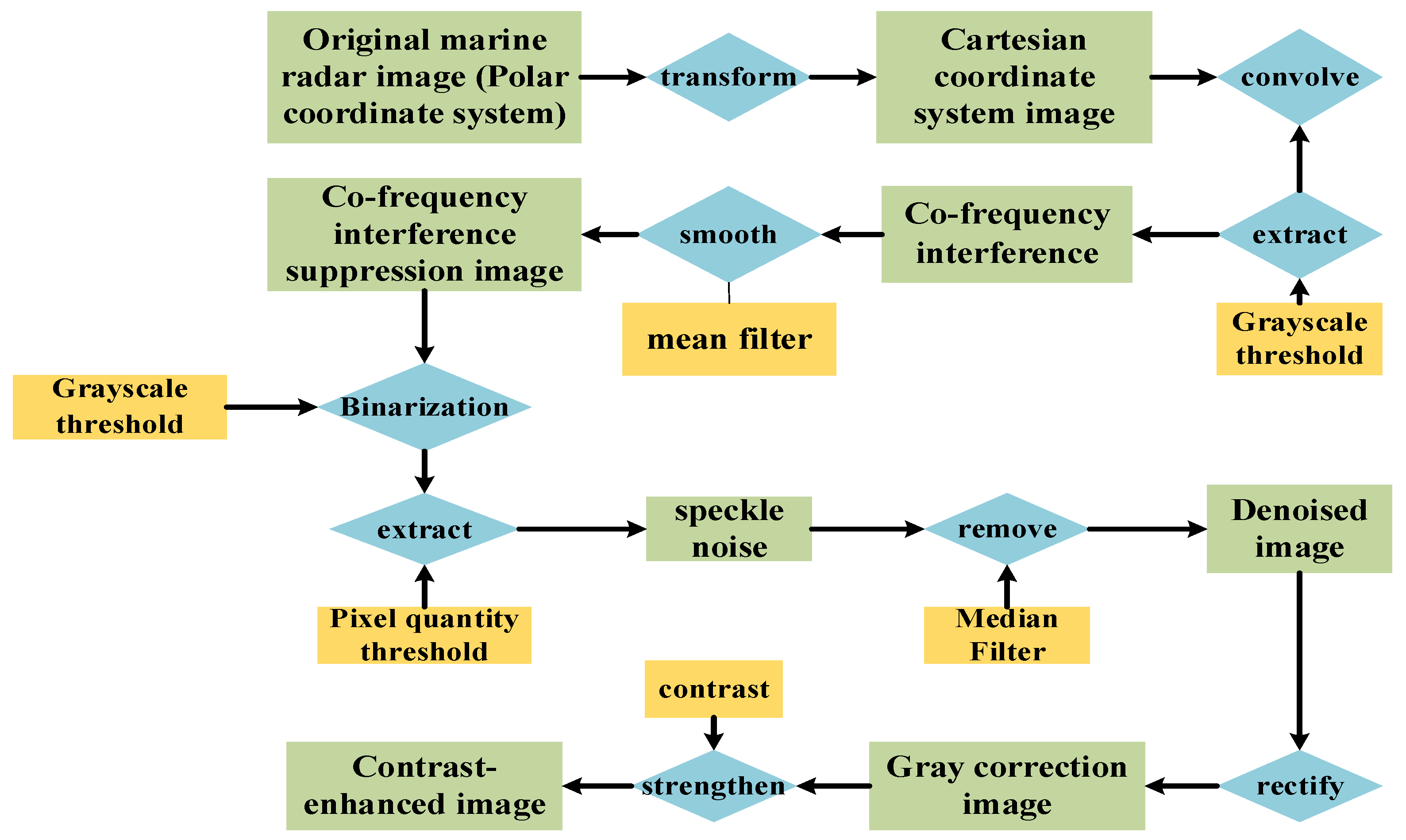Compared to SAR-based monitoring, marine radar systems offer not only superior cost-effectiveness but also greater adaptability for multi-platform deployment. Additionally, the systems can support real-time monitoring of targets, including oil spills, with high temporal resolution. Liu et al. proposed an adaptive enhancement method based on X-band marine radar, which segmented images into several strips of varying thicknesses [