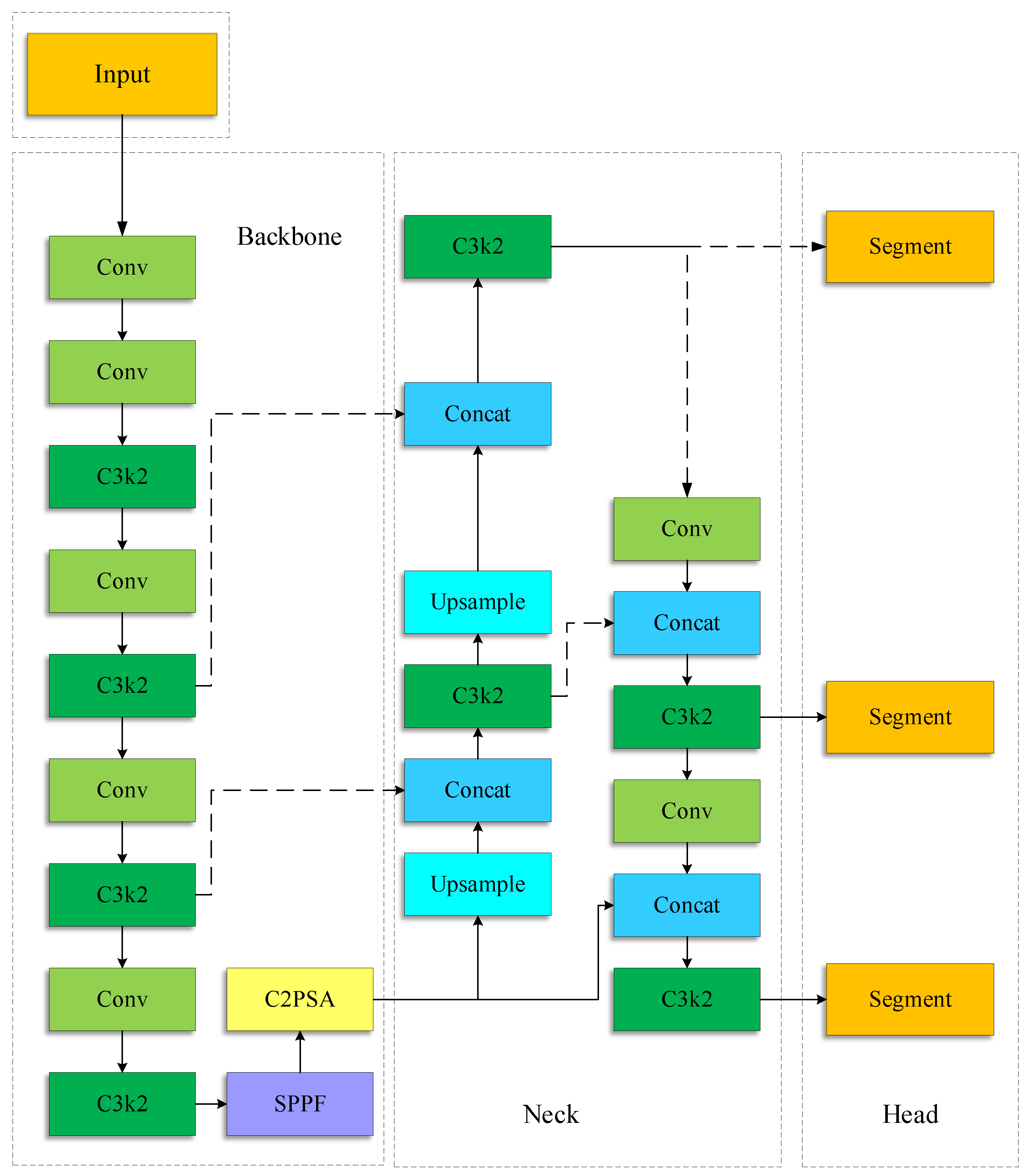 The YOLOv11 architecture is divided into four functional modules: input, backbone network, neck network, and output head (