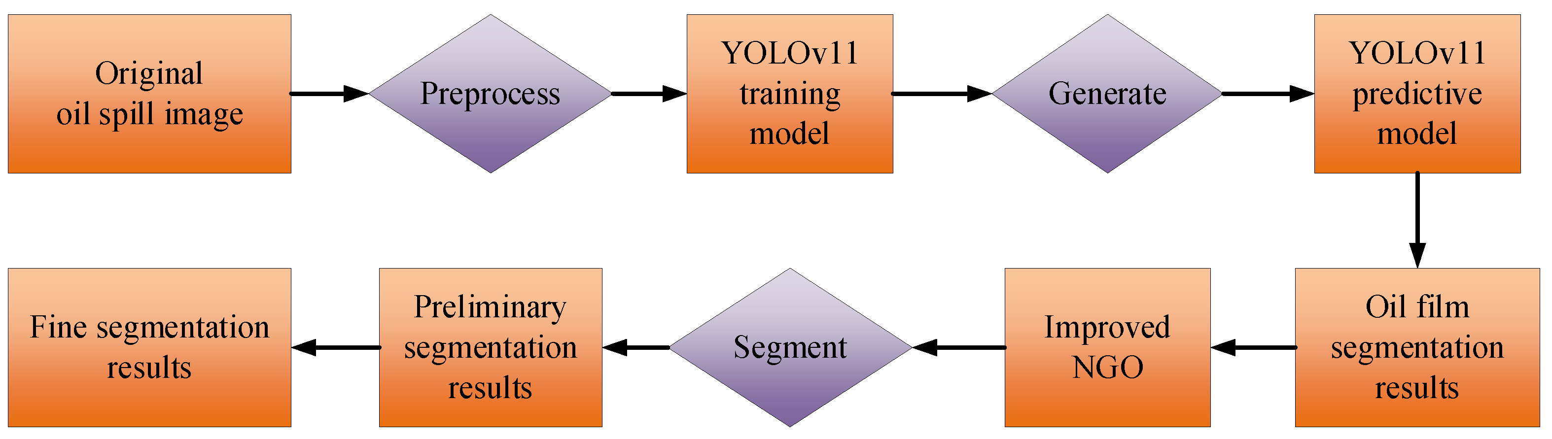 This framework capitalized on the respective strengths of its components. The real-time requirement for marine oil spill monitoring was ensured by the coarse segmentation achieved by the YOLOv11 model. Meanwhile, the Precision of localized segmentation was enhanced through an improved NGO algorithm. By synergistically integrating these modules, a balanced solution was provided for oil spill detection in complex marine environments. This effectively coordinates operational efficiency and segmentation accuracy. The entire experimental process is shown in