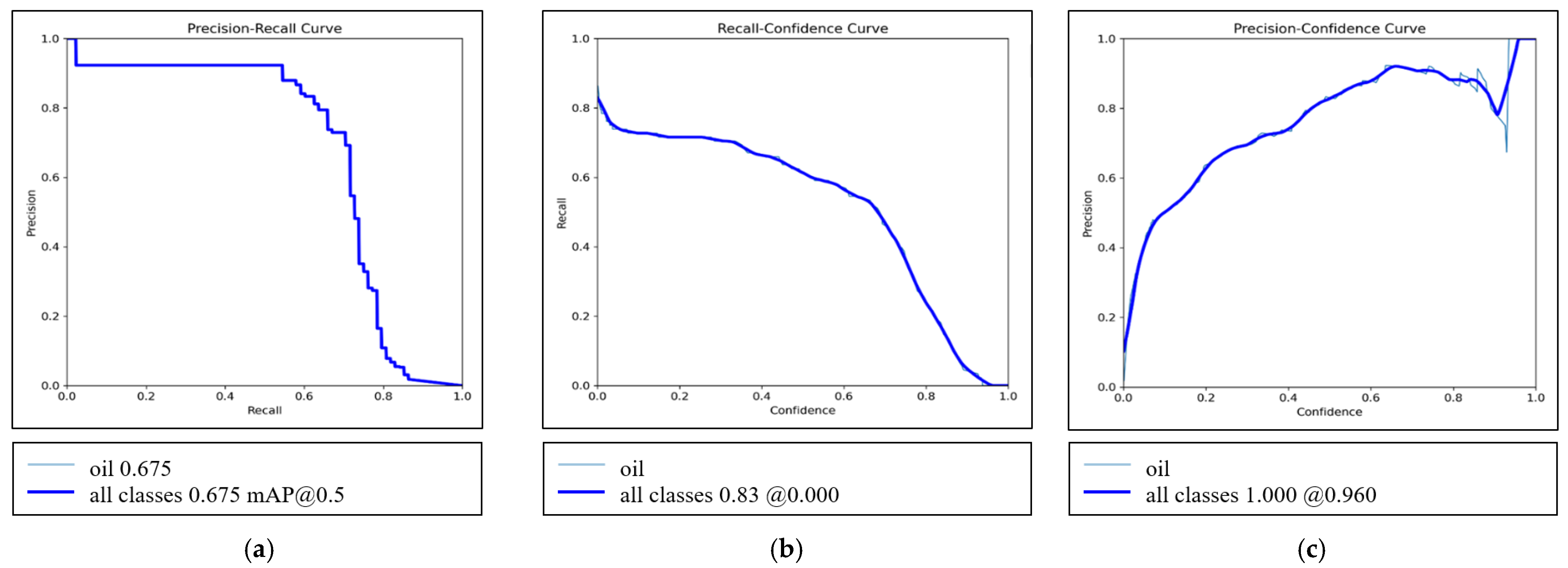 By dynamically adjusting confidence thresholds, the Precision-Recall Curve (PRC) intuitively reveals the trade-off between Precision and Recall across different scenarios. As the confidence threshold gradually increases from 0 to 1, the model retains numerous low-confidence bounding boxes at lower thresholds, achieving higher recall but with increased false positives. With higher confidence thresholds, the system preserves fewer predictions, leading to a decline in recall and a corresponding rise in precision. The Average Precision (AP) quantifies detection quality for individual classes, while the mean AP (mAP) comprehensively evaluates overall model performance. mAP@0.5 Refers to mAP at Intersection over Union (IoU) ≥ 0.5. Ideally, the PRC should exhibit a smooth decay trend, indicating that the model maintains a balance between higher Recall and Precision even at elevated confidence thresholds.