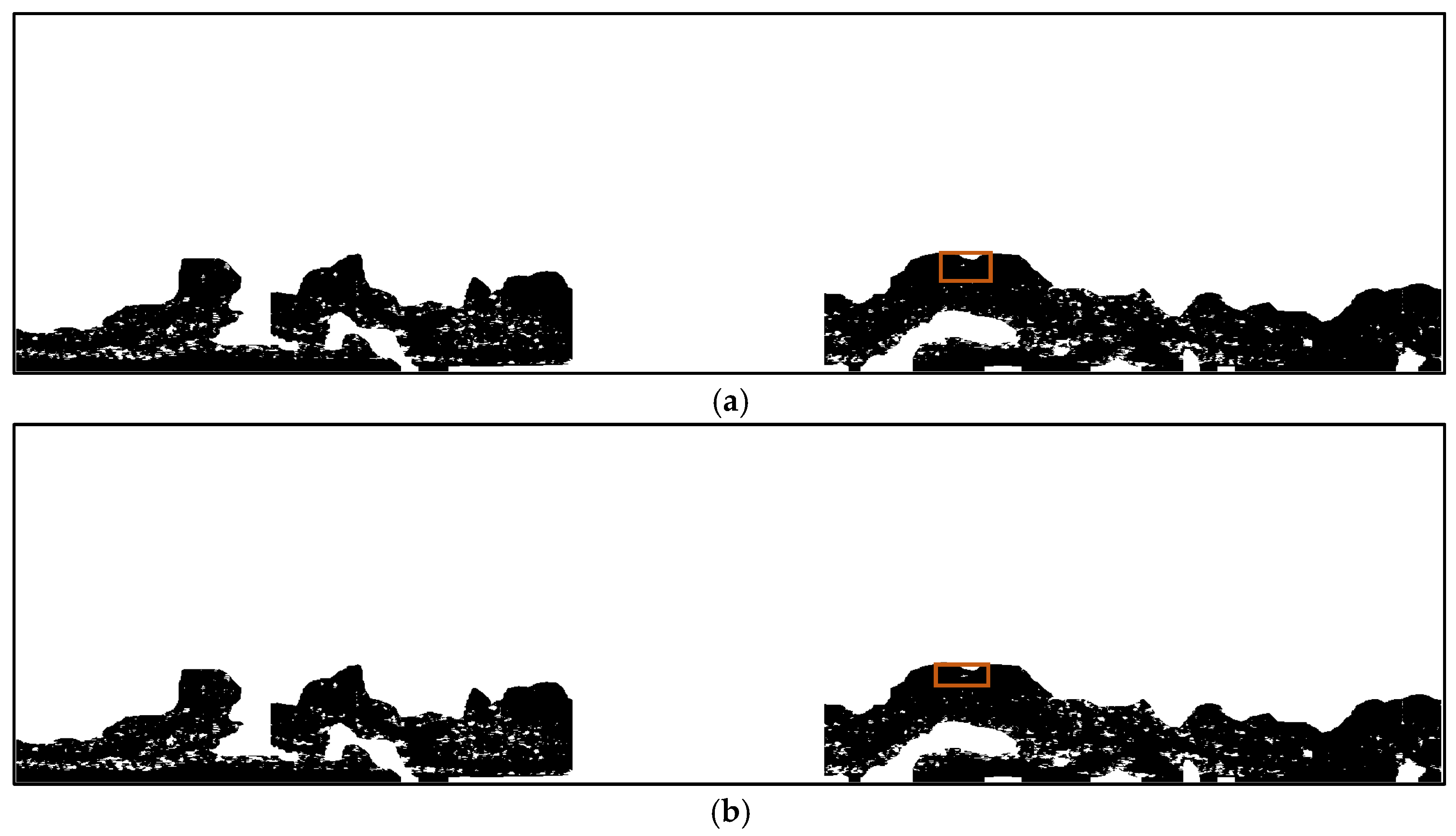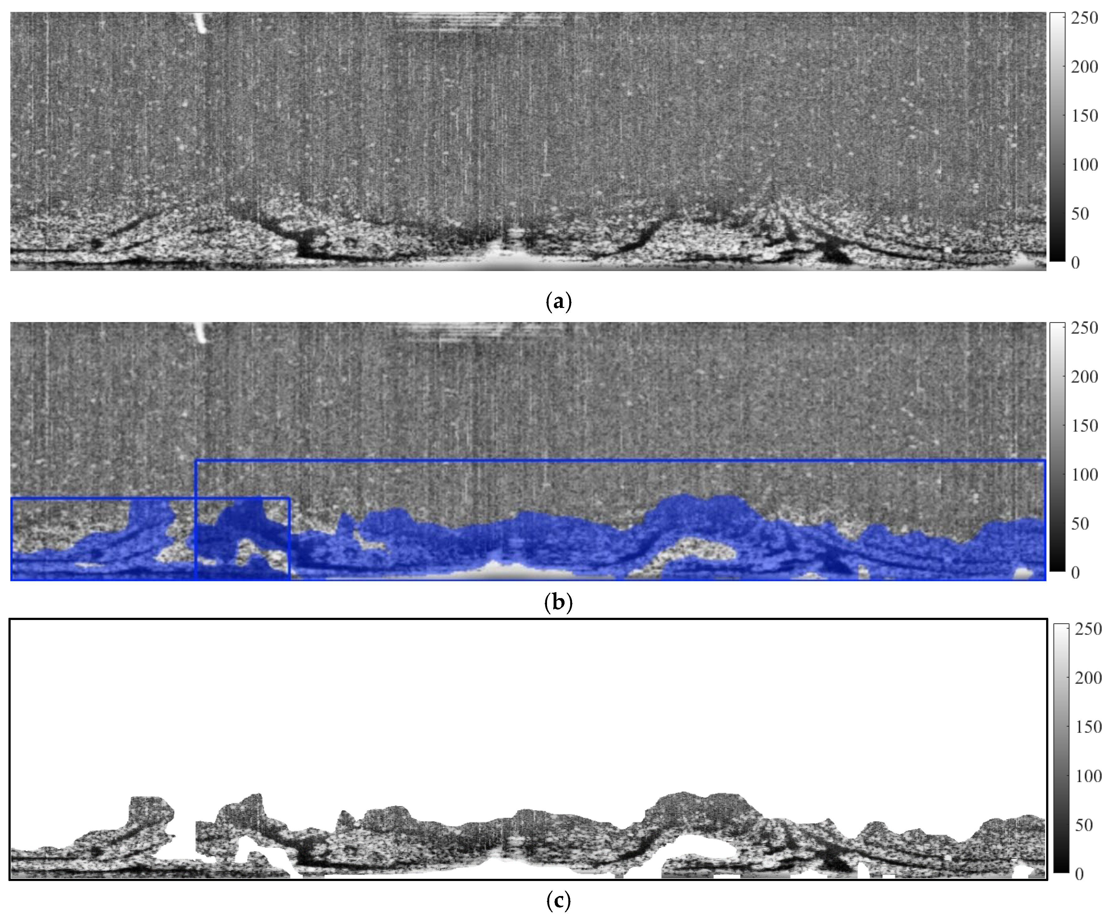 Given that oil films exhibit relatively dark image characteristics, high-intensity targets (particularly those within oil film regions) may interfere with target identification accuracy. So, a dual-threshold method was employed for high-intensity target extraction. And, a median filter was employed to eliminate residual noise, as shown in