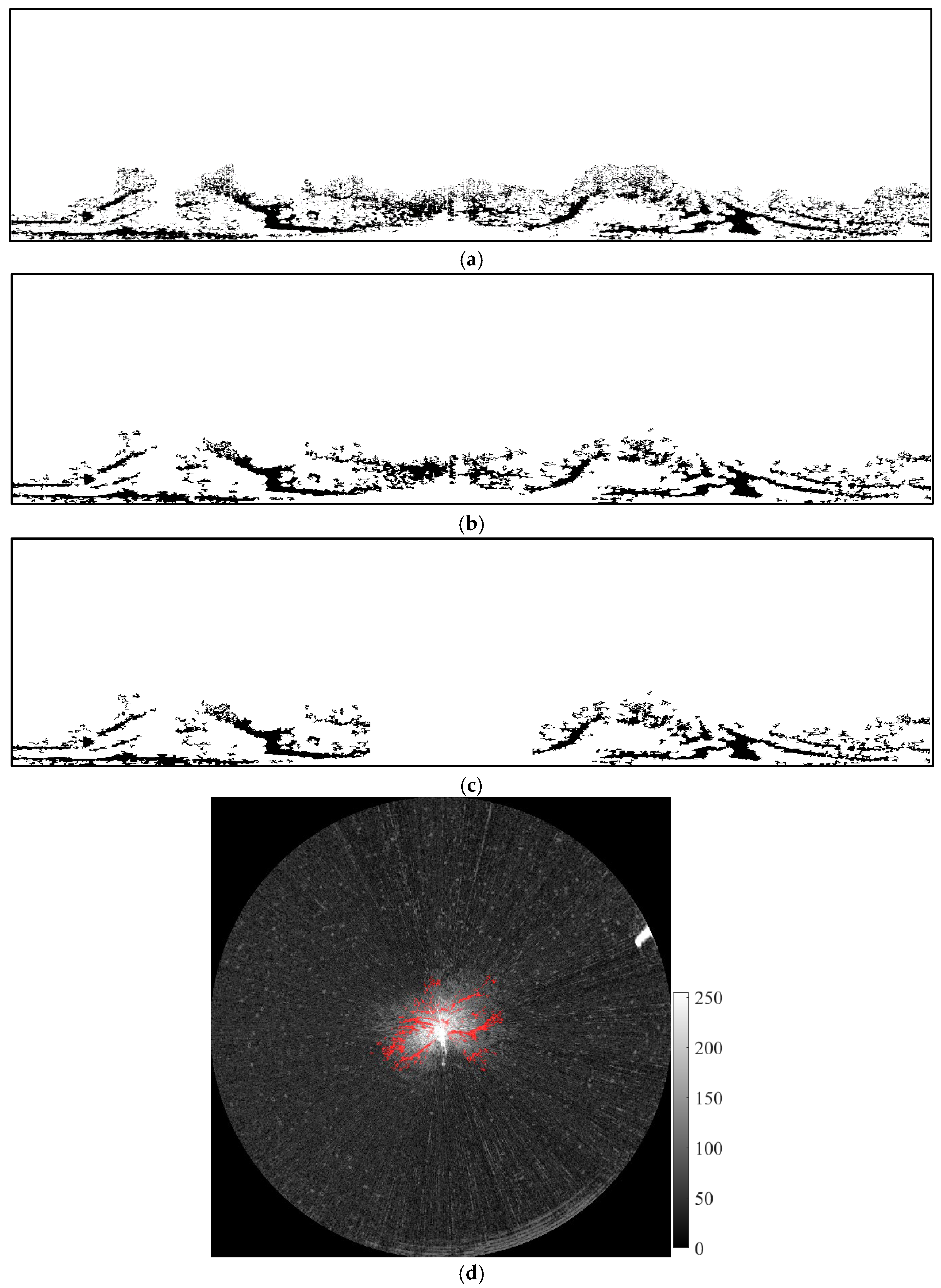 29]. Threshold values, derived from the statistical distribution of oil contamination frequencies across varying strip thicknesses, were subsequently employed to differentiate spill targets. They later proposed a texture analysis-based method for oil spill detection using X-band marine radar images, which employed an adaptive threshold technique to accurately distinguish between seawater and oil spill regions [