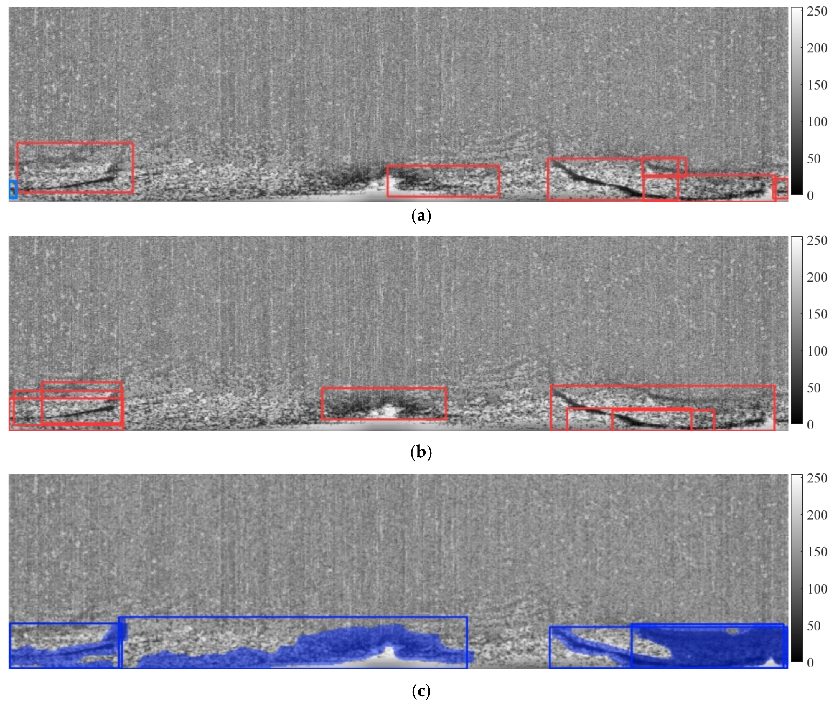 32]. This methodology further employed a Back Propagation (BP) neural network to compute valid wave zones. The method was characterized by intact oil film delineation, minimal segmentation boundaries, and near-zero false positive targets in extraction results. Some scholars employed the YOLOv8 object detection model to achieve effective identification of oil spill monitoring zones in the marine radar images [