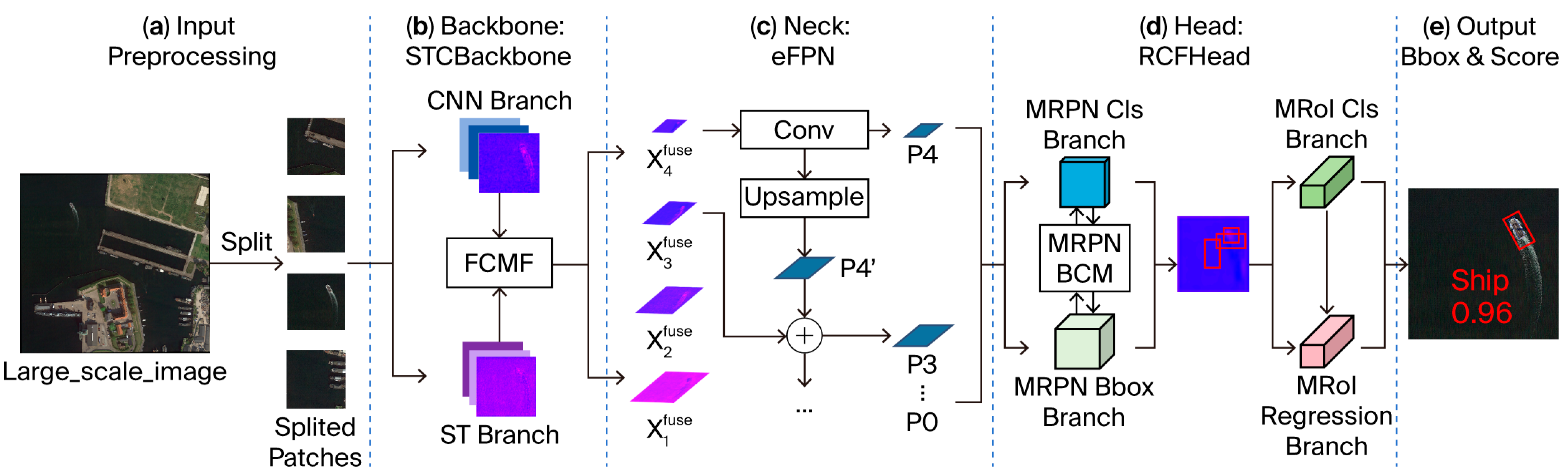 - We present a tightly coupled dual-branch backbone, Swin Transformer–CNN Backbone (STCBackbone) that features integrated ST and CNN branches. Through residual feature injection and the proposed FCCM, the model effectively aligns and enhances local and global features, enabling robust multi-scale representation of ships in complex remote sensing scenes.