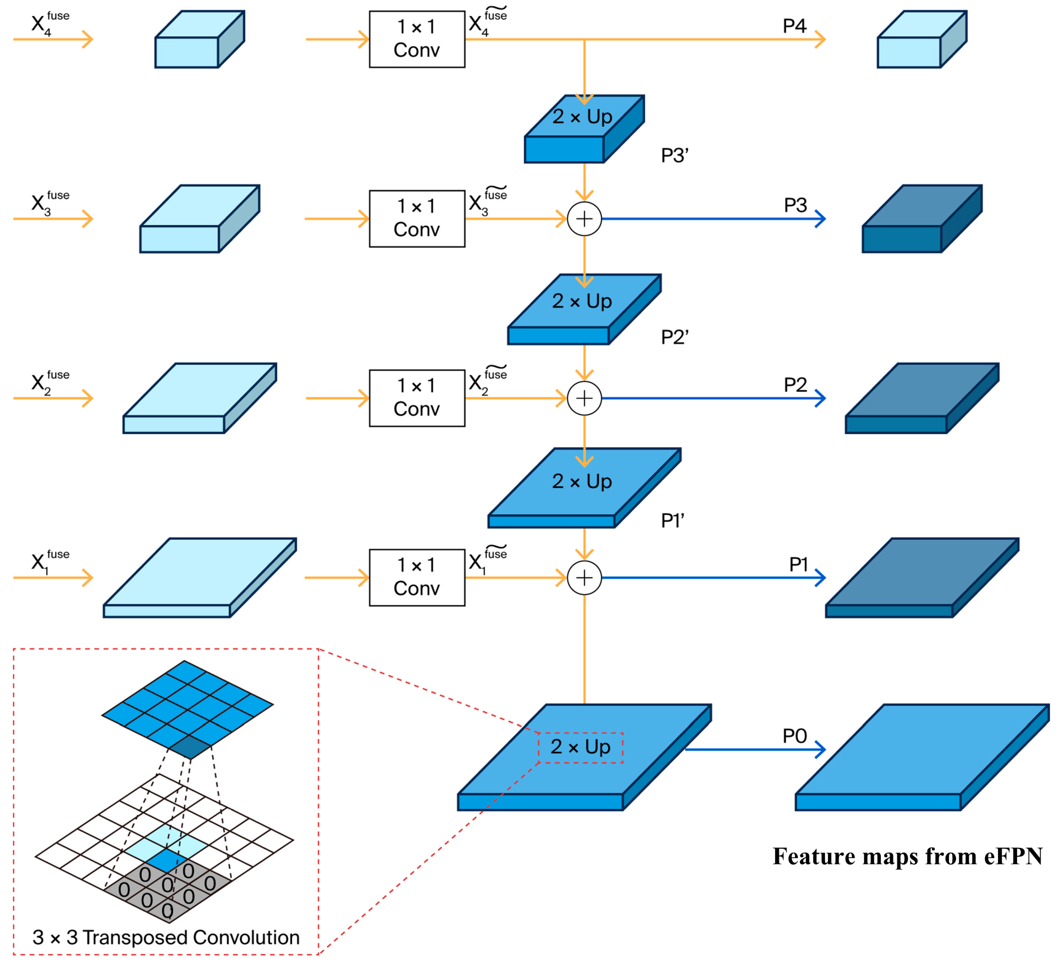 - We develop an eFPN equipped with learnable transposed convolutions for adaptive upsampling. This design helps preserve fine-grained spatial details while promoting consistent and efficient multi-scale feature fusion.