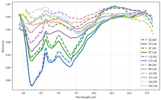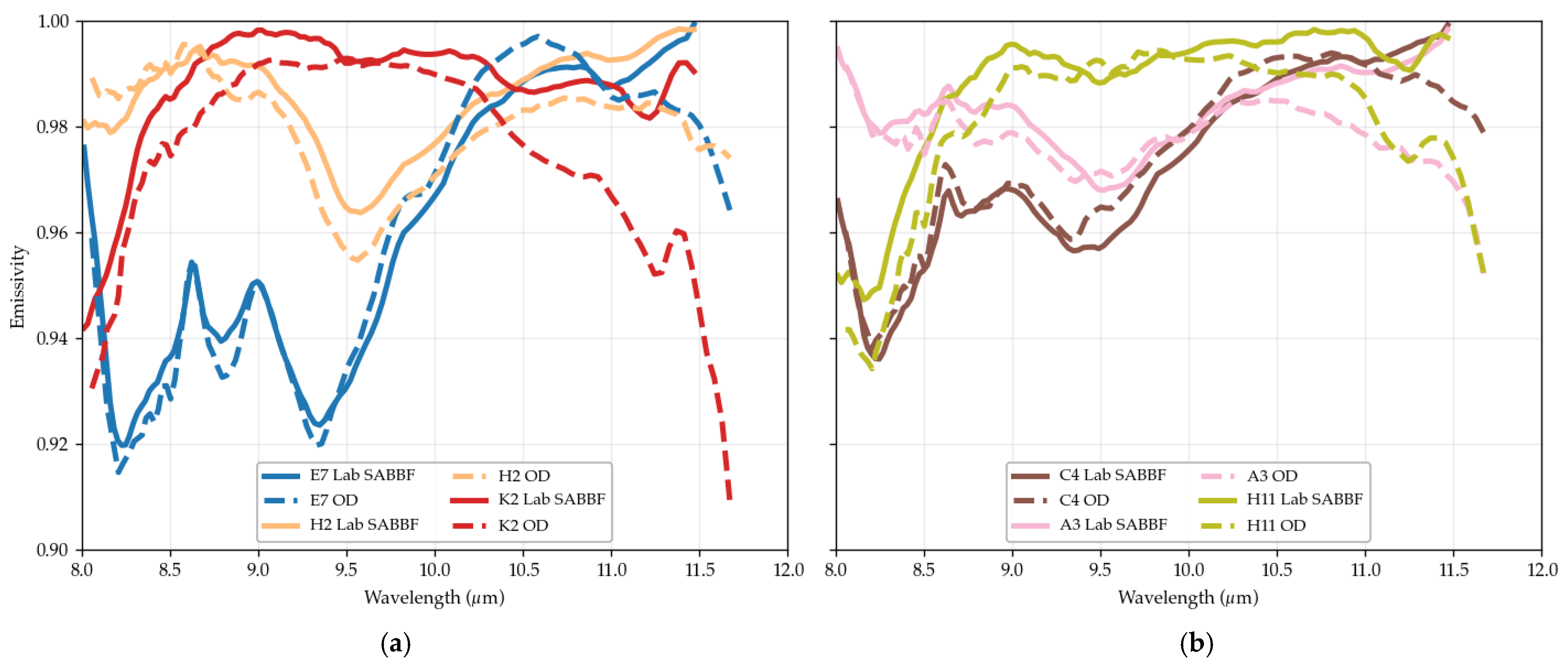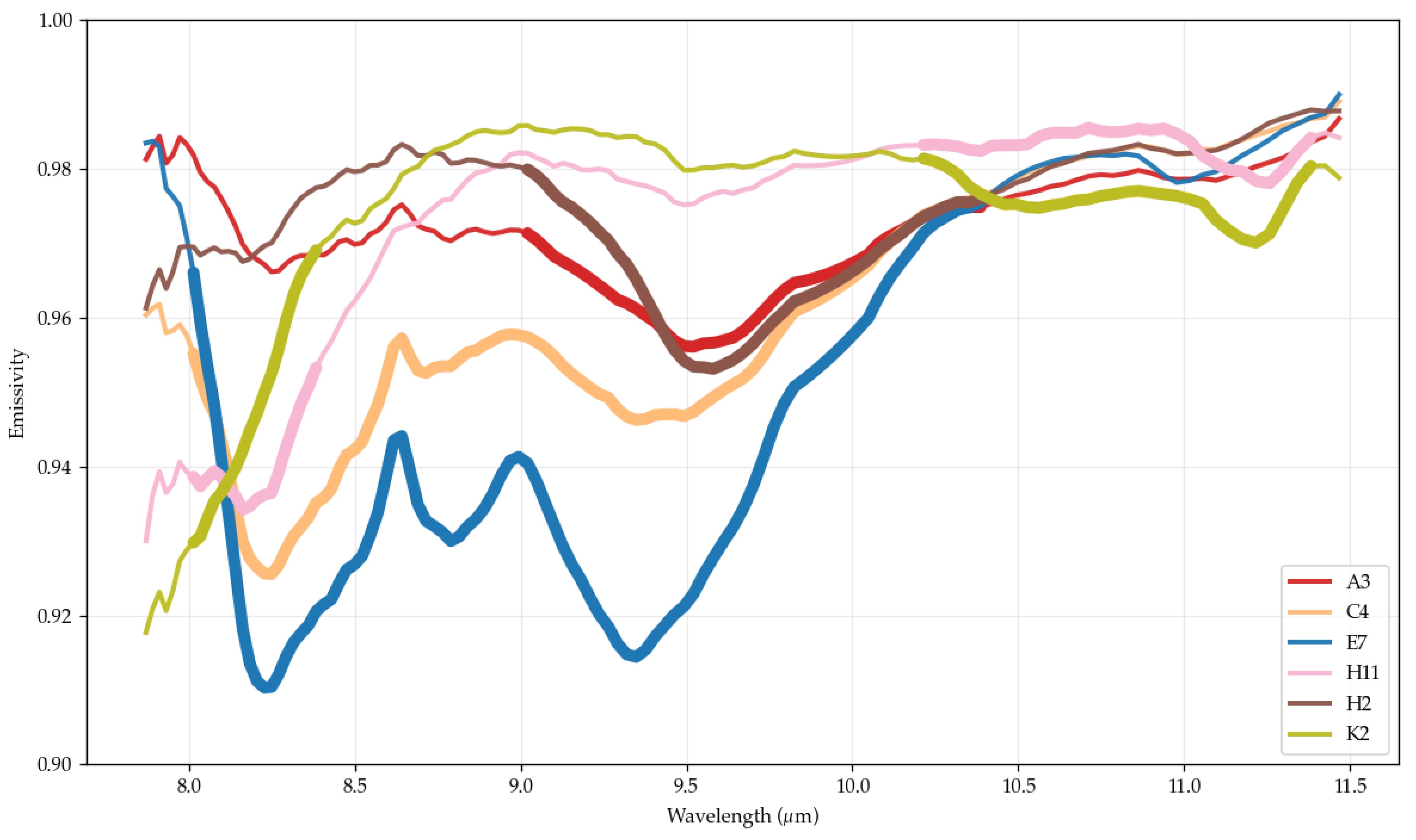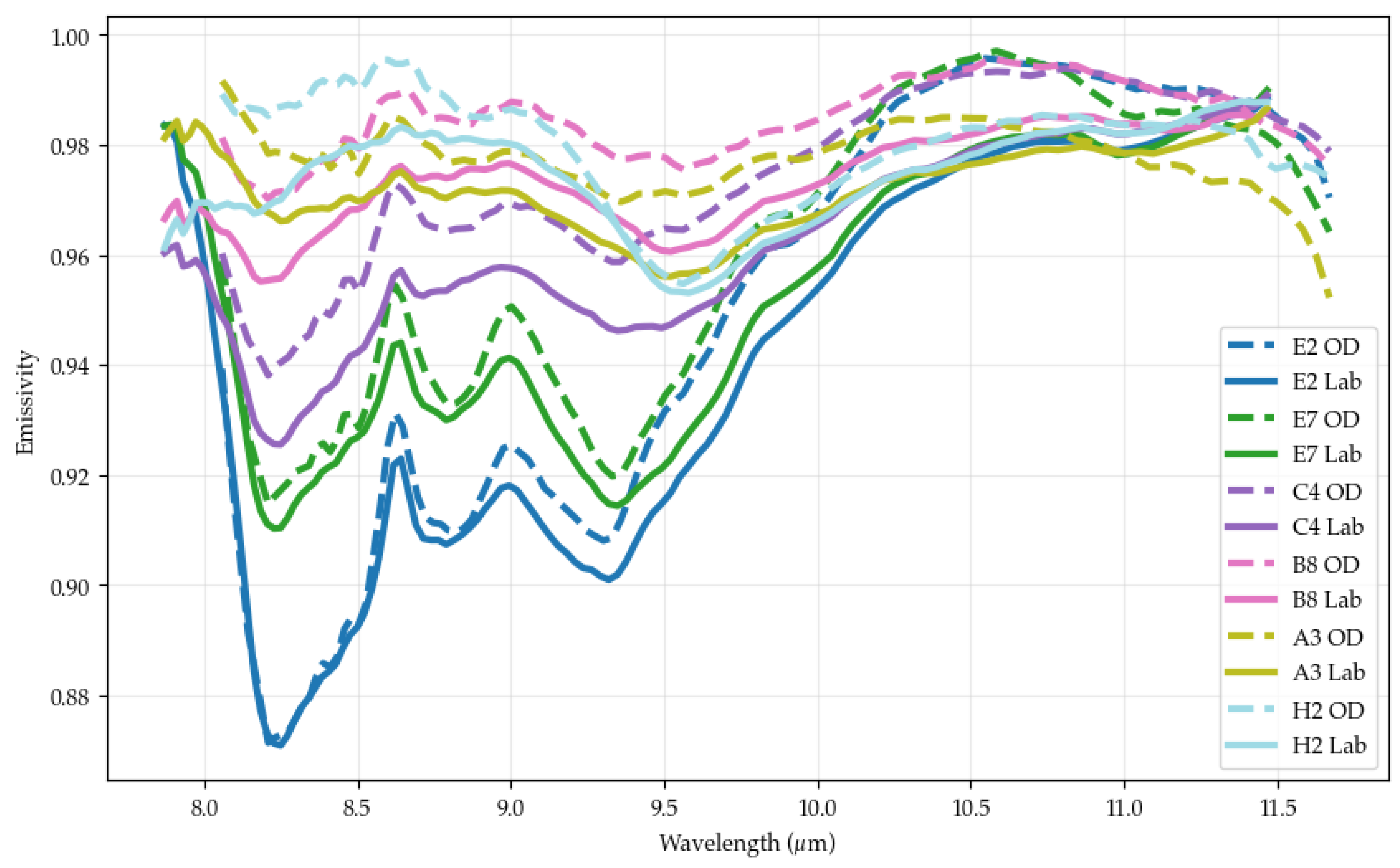 - Hecker, C.A.; Smith, T.E.L.; Da Luz, B.R.; Wooster, M.J. Thermal Infrared Spectroscopy in the Laboratory and Field in Support of Land Surface Remote Sensing. In Thermal Infrared Remote Sensing; Kuenzer, C., Dech, S., Eds.; Remote Sensing and Digital Image Processing; Springer: Dordrecht, The Netherlands, 2013; Volume 17, pp. 43–67. ISBN 978-94-007-6638-9. [Google Scholar]
