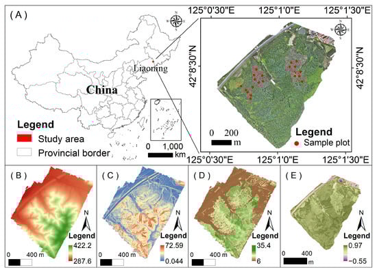 Overview of the study area. (A) Location of the study area in Qingyuan County, Liaoning Province, northeastern China. The right panel shows a high-resolution orthophoto and the distribution of field sampling plots. (B) Digital elevation model (DEM, m). (C) Slope (°) derived from the DEM. (D) Canopy height model (CHM, m) generated from airborne LiDAR data. (E) Normalized difference vegetation index (NDVI) derived from multispectral imagery.