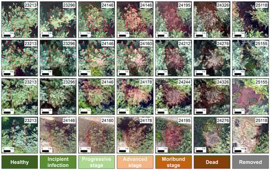 To accurately identify the progressive stages of pine wilt disease, high-resolution multispectral imagery acquired by unmanned aerial vehicles (UAVs) was employed. Manual visual interpretation was conducted to analyze canopy characteristics of individual trees, thereby establishing diagnostic criteria for disease staging. The interpretation criteria included canopy color, textural features, structural integrity, and the degree of branch and foliage exposure (Table 2, Figure 2). Canopy color was primarily used to capture the transition of needle coloration from green to yellow and subsequently to red, while texture and structural integrity characterized canopy density and fragmentation. The degree of branch and foliage exposure reflected the progression of crown degradation and mortality. To ensure the objectivity and reliability of the labeling results, three interpreters independently performed blind assessments without access to others’ annotations or prior information, followed by a reconciliation process for inconsistent cases. To assess the reliability of the interpretation results, the visually derived classifications were systematically compared with field survey data from 20 sample plots. The results exhibited a high degree of concordance, with an overall canopy condition classification accuracy of 98.4% at the plot scale, demonstrating that the proposed visual interpretation criteria effectively discriminate between healthy and declining trees. The annotated results for Phase 23 are presented in Figure A2.