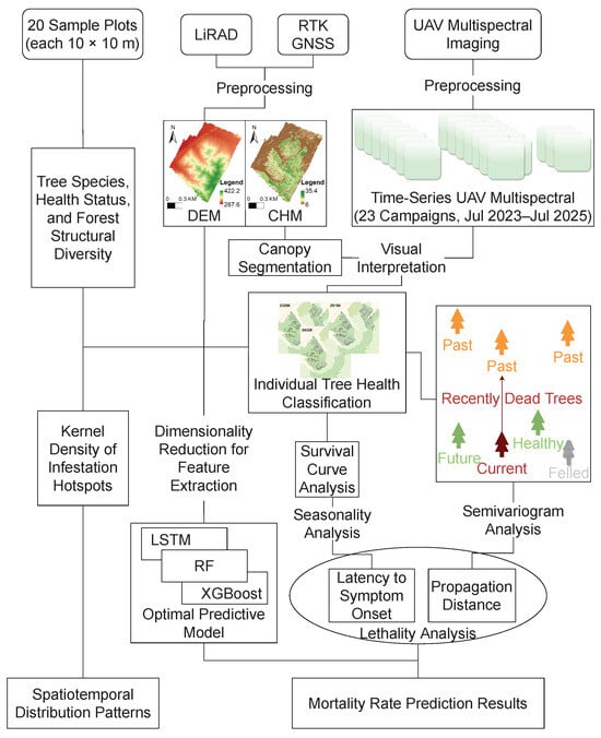 To this end, this study focuses on Qingyuan Manchu Autonomous County in Liaoning Province, a representative epidemic area of PWD, as the study region. Leveraging high-density, long-term multispectral UAV remote sensing imagery, we establish a monitoring and detection framework for PWD at the individual-tree scale. By extracting multi-source remote sensing features of infected tree canopies throughout the mortality process, we systematically characterize the spatial diffusion patterns and lethal dynamics of the disease. On this basis, we integrate multi-temporal vegetation indices, individual-tree structural attributes, and topographic–environmental variables to construct a spatiotemporal variable set driving PWD spread. Multiple machine learning models are then introduced to predict individual-tree mortality risk at the stand scale, thereby assessing their capability to identify transmission pathways and model dispersal dynamics across spatial domains.