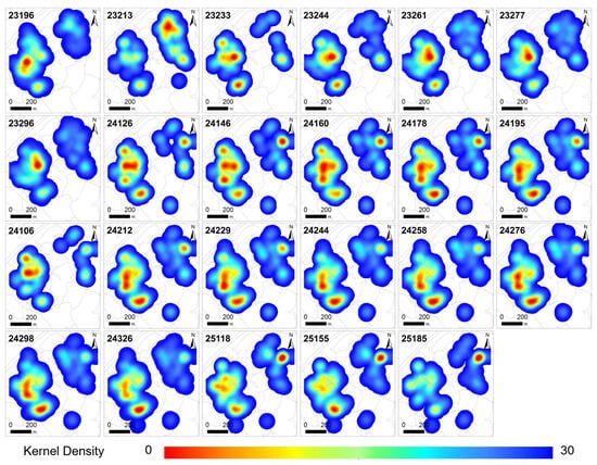 In the early phase of the 2023 outbreak (days 23196–23296), tree mortality was highly aggregated, predominantly concentrated within the interior of the forest stand. Following the initial logging operation on day 23213, the core zone area decreased sharply by 17.2%, with a notable reduction in hotspot frequency. The western hotspot weakened significantly, leaving only a few residual high-density points.