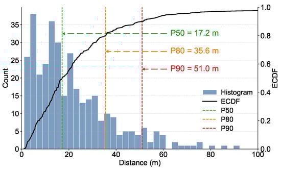 In this study, the straight-line distance between each newly infected pine and the nearest previously dead pine was defined as the “nearest diseased-tree distance” and quantified directly, with results presented in Figure 6. The distribution of these distances exhibited a pronounced right-skewed pattern, with most newly infected trees occurring at relatively short distances, indicating strong local dispersal and spatial clustering of pine wilt disease. Specifically, 50% of transmission events occurred within 17.2 m (P50), suggesting that disease spread is primarily driven by localized, neighbor-to-neighbor transmission. Additionally, 80% of events were confined within 35.6 m (P80), and 90% did not exceed 51.0 m (P90), demonstrating that the majority of transmission events occur within a fine-scale range of less than 20 m. Although rare long-distance transmission events exceeding 80 m were observed in the tail of the distribution, their low frequency underscores that local reinfection and short-range spread among adjacent trees dominate the dispersal dynamics of pine wilt disease. Long-distance dispersal events are likely associated with vector insect activity, topographic factors, or anthropogenic disturbances.