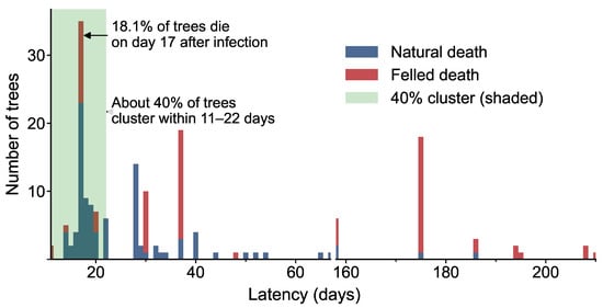 Further analysis revealed that 90% of mortality events occurred within 16–275 days, with an extended tail indicating substantial inter-individual variation in disease progression. Naturally deceased trees were predominantly associated with shorter latency periods, while logging removals were more frequent in the intermediate to late stages.