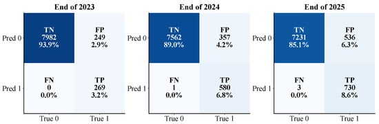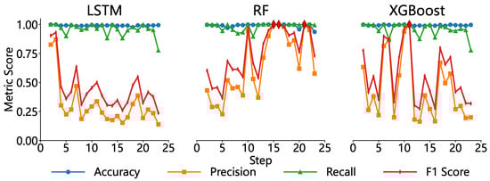The results indicated that, despite achieving relatively high overall accuracy, the Long Short-Term Memory (LSTM) model exhibited consistently low Precision and F1 scores, reflecting its limited ability to distinguish true positives from false positives. This aligns with the known tendency of deep temporal models to overfit in small-sample scenarios, prioritizing higher Recall over Precision [49]. The XGBoost model demonstrated superior Precision and F1 scores at specific forecasting horizons but displayed significant temporal variability, underscoring its sensitivity to data distribution, consistent with prior findings on the instability of boosting-based models [50].