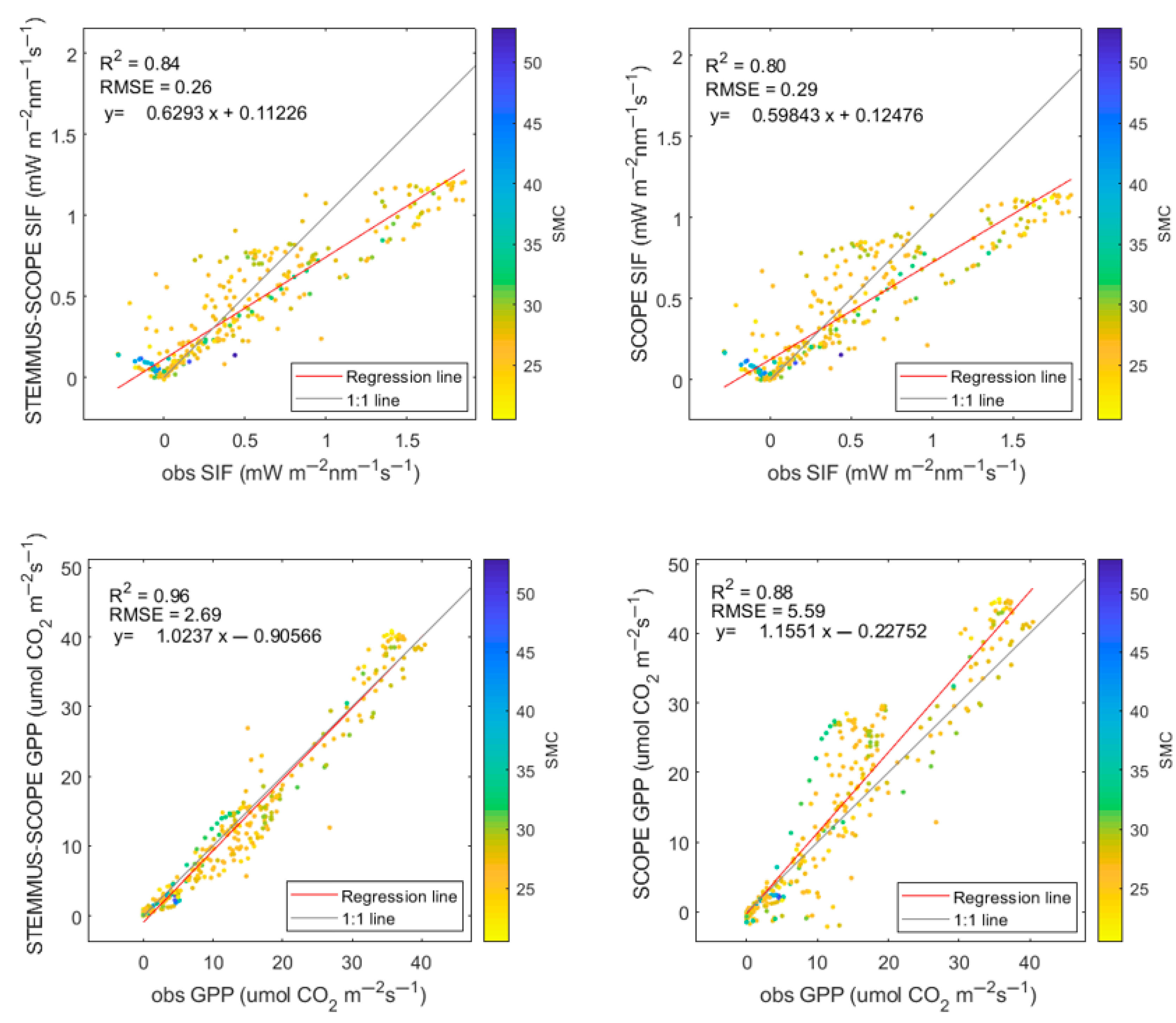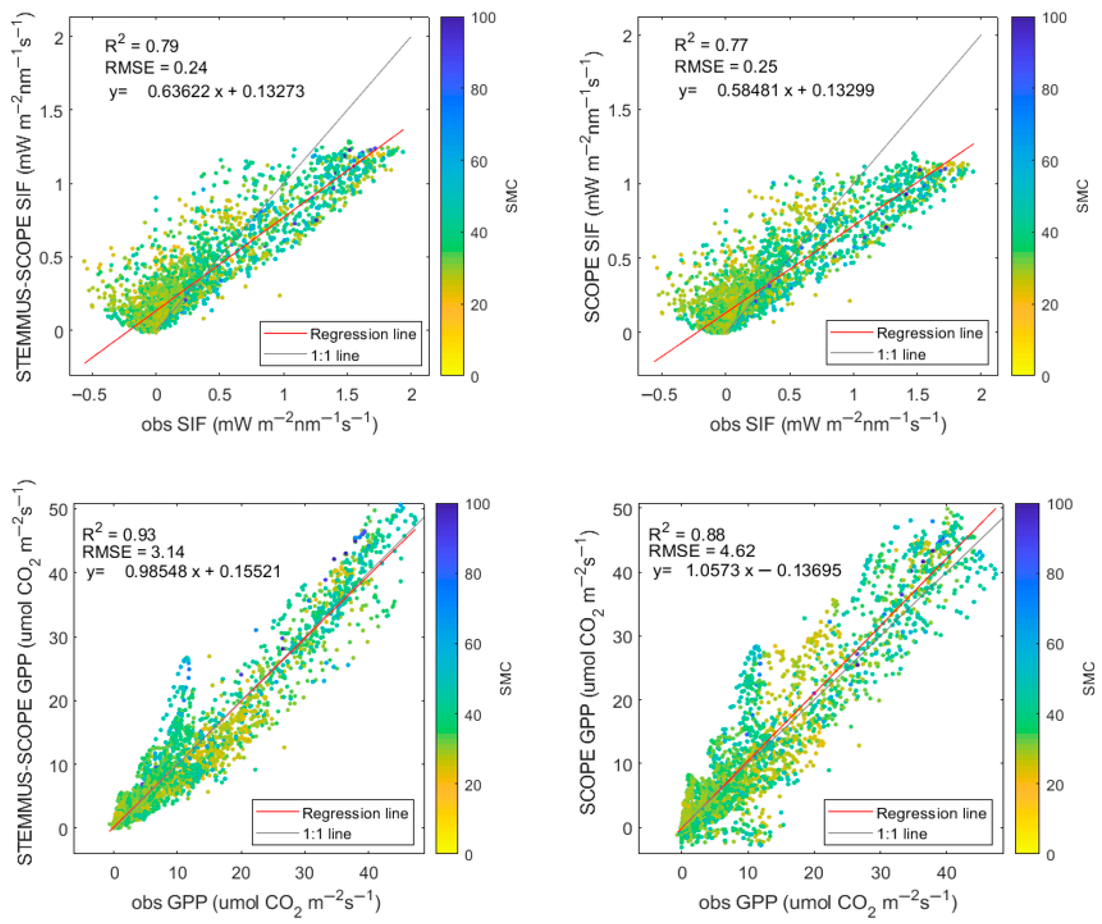 3.1. Comparison of the Accuracy of the STEMMUS-SCOPE and SCOPE Models for GPP and SIF Simulation
