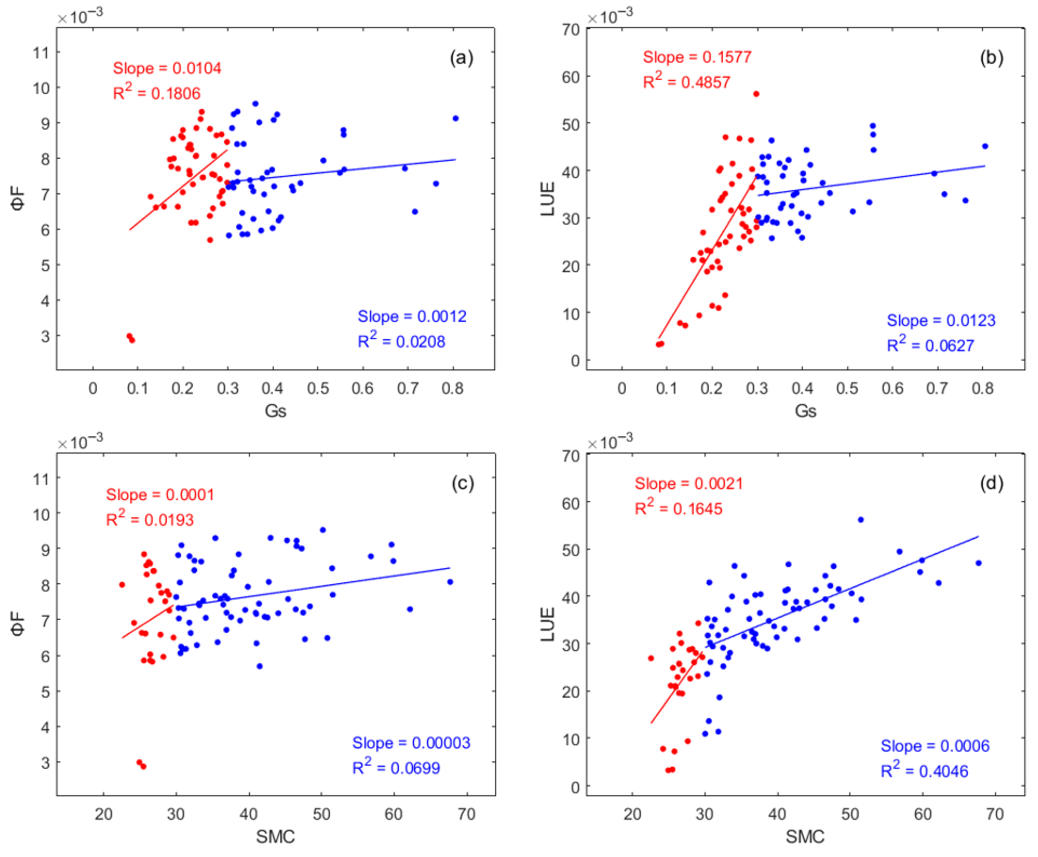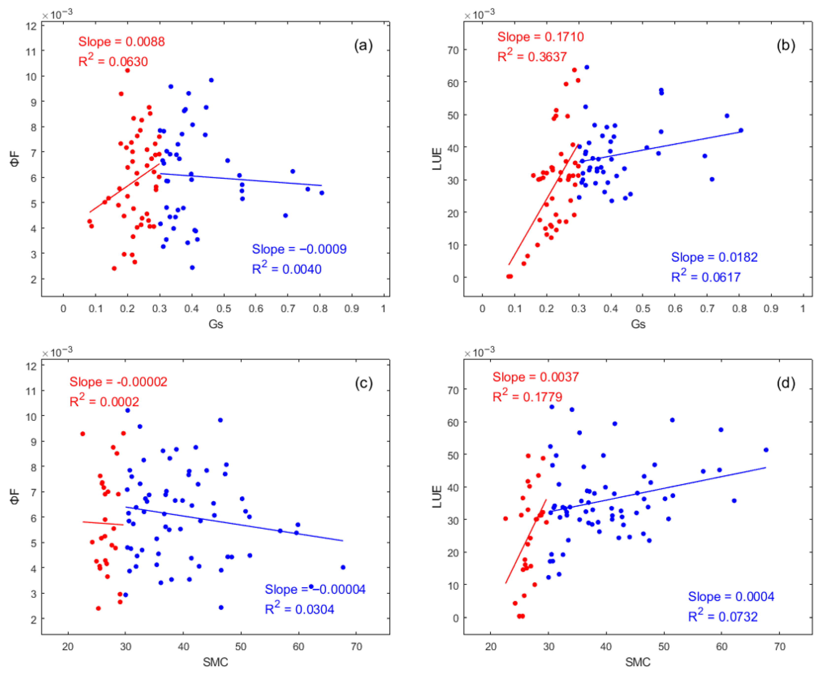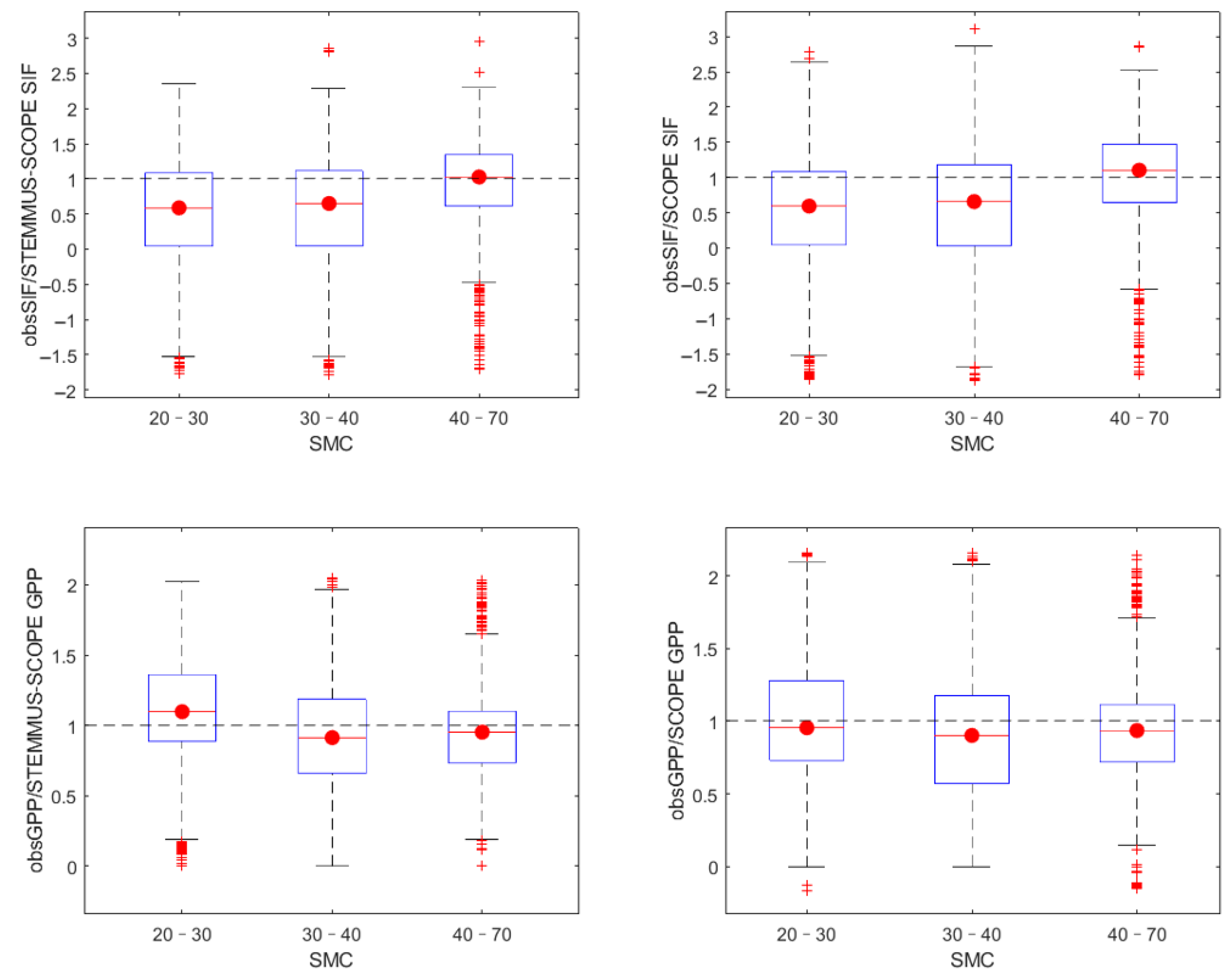 3.3. Responses of STEMMUS-SCOPE-Simulated ΦF and LUE to Varying SMC