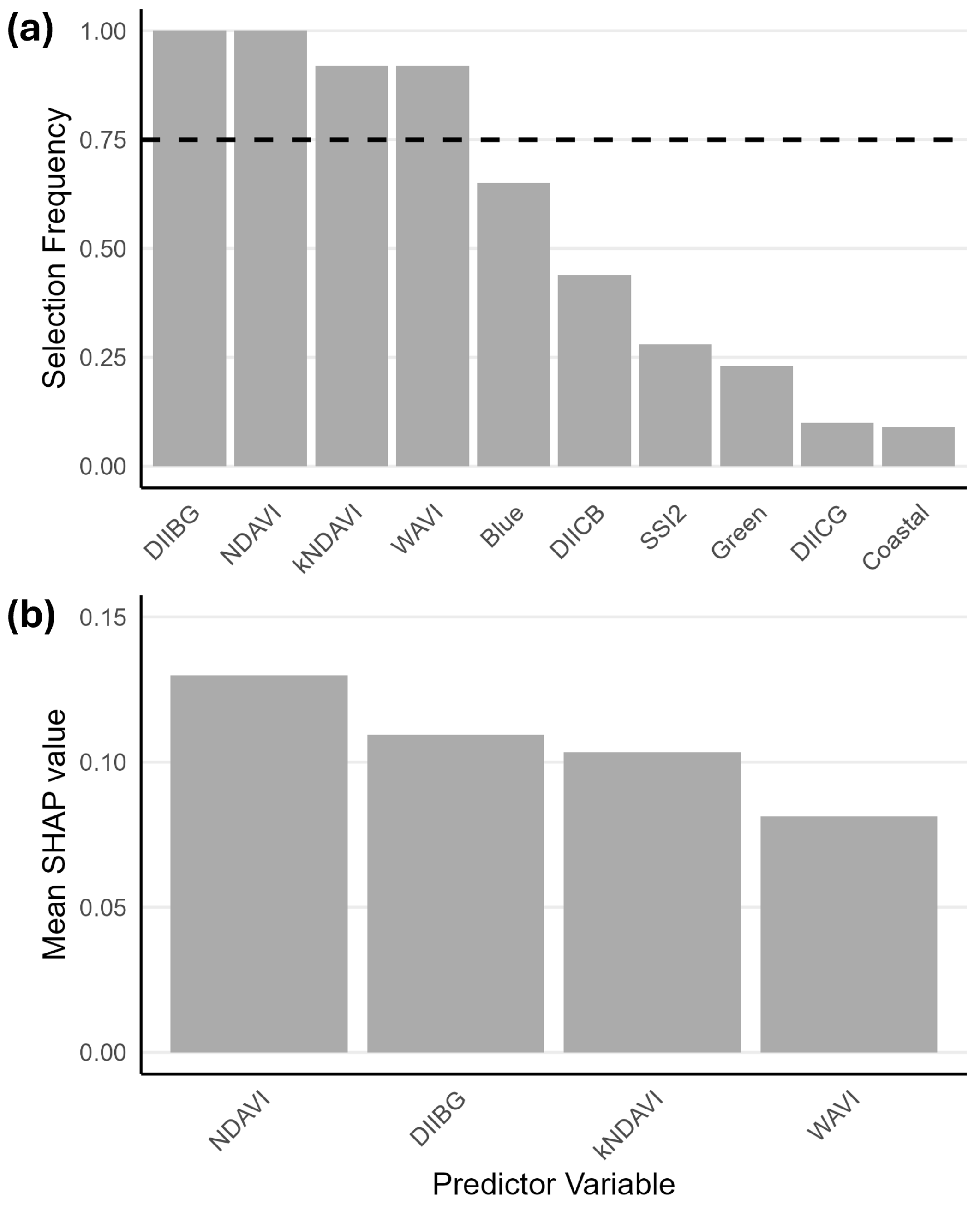 - Four spectral indices were identified as important for the quantification of seagrass within and adjacent to the MSC-certified Western Australia Enhanced Greenlip Abalone Fishery. The Normalised Difference Aquatic Vegetation Index (NDAVI) and Depth Invariant Index of the blue and green bands were the most important indices.