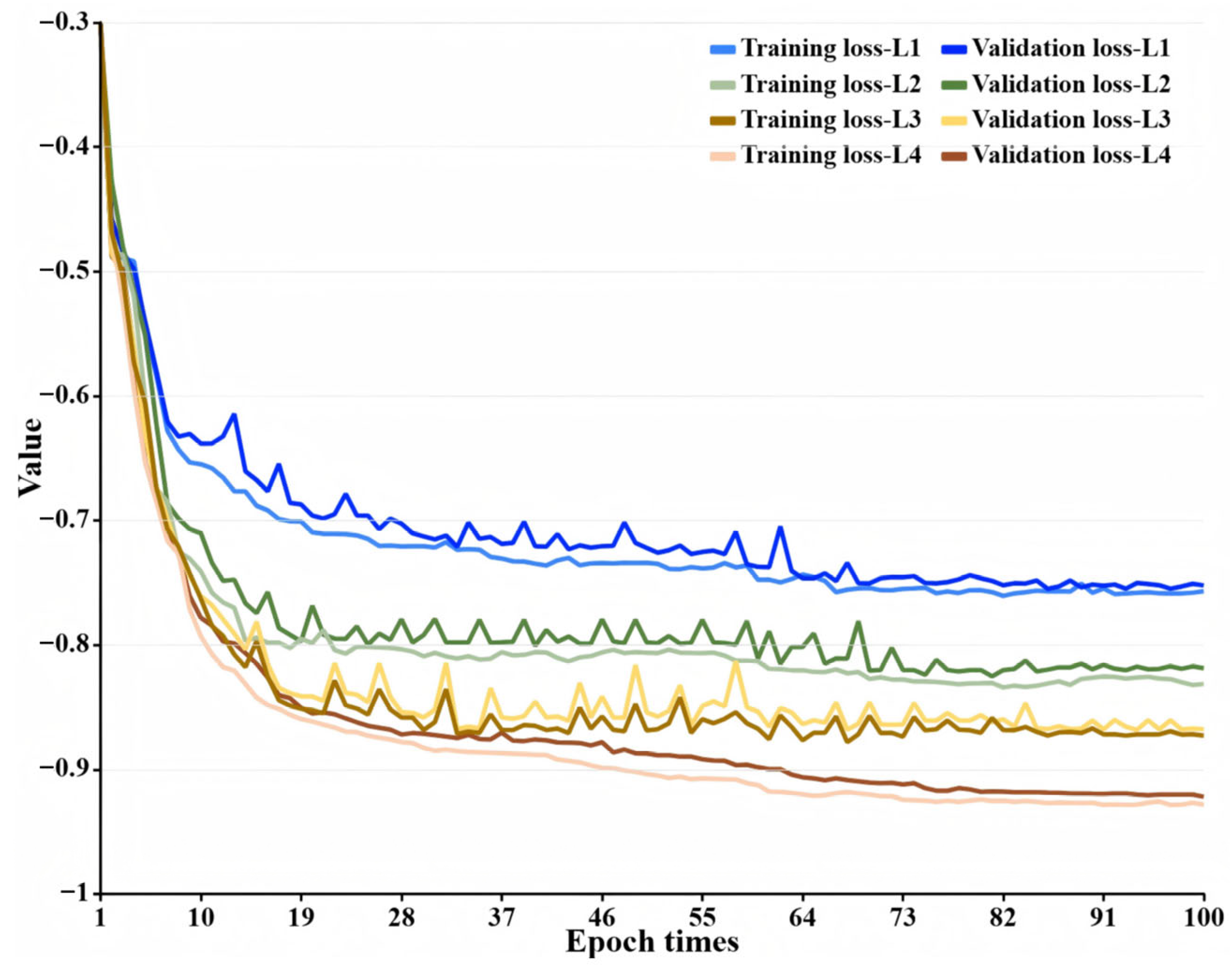 So that lower (and possibly negative) values of L correspond to better agreement between predictions and reference labels. Model optimization was performed using stochastic gradient descent (SGD) with a momentum of 0.9 and the following key hyperparameters: an initial learning rate of 0.0006, weight decay of 0.00025, and 2000 training epochs. To prevent overfitting and accelerate convergence, an early stopping mechanism was adopted: training was terminated if the validation loss failed to decrease for 100 consecutive epochs. Additionally, a learning-rate decay schedule was applied—when the validation loss plateaued for three consecutive epochs, the learning rate was halved. Experimental results demonstrate that the proposed approach achieved high convergence efficiency and training stability in soybean mapping tasks based on multi-temporal remote sensing imagery.