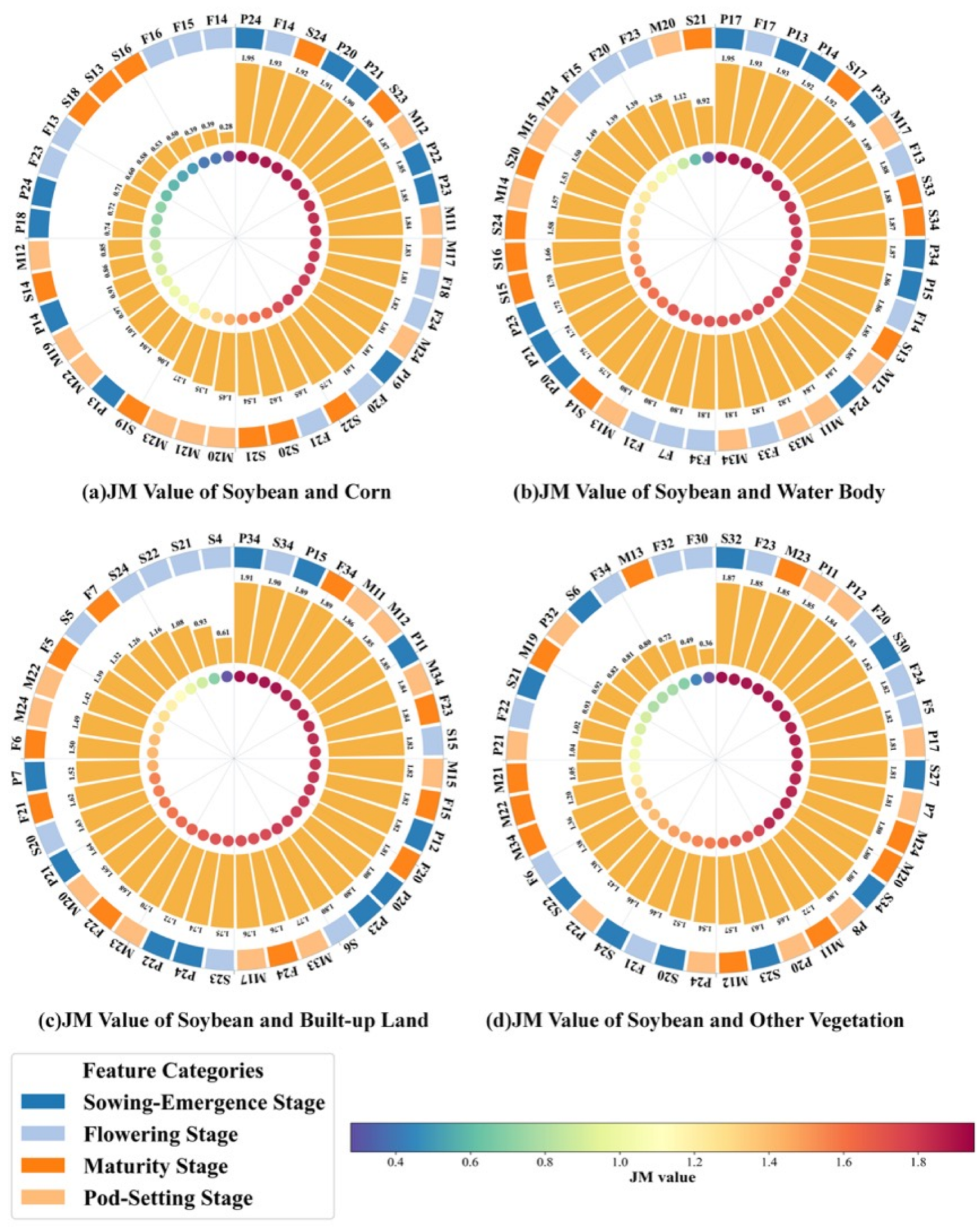 A total of 136 candidate features were comprehensively analyzed in this study, encompassing four categories: original spectral bands, vegetation indices, texture features, and polarization parameters. For each of the four key temporal phases, the Jeffries–Matusita (JM) distance between the soybean and non-soybean classes was computed using Equation (1), yielding separability values for four class pairs. As illustrated in Figure 5, the enrichment map visualizes the JM distance distribution across temporal phases and feature types, effectively revealing the inter-class separability patterns under different phenological and data-fusion conditions. This visualization highlights how specific temporal–spectral–polarization combinations contribute to class discrimination, thereby providing a quantitative and physically interpretable basis for feature selection in the subsequent crop-type classification process.