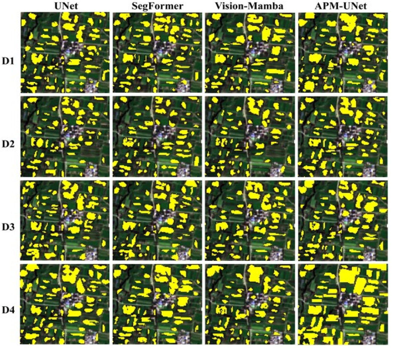 To rigorously assess the efficacy of JM distance-based feature selection for dimensionality reduction, redundancy suppression, and computational economy—and to evaluate the feasibility and advantages of APM-UNet for soybean mapping—we benchmarked against three representative paradigms: U-Net (convolutional), SegFormer (Transformer), and Vision-Mamba (state-space/Mamba). All models were reproduced under identical preprocessing, input modalities (Sentinel-1/2 and their fusion), training schedules, and evaluation protocols, and were contrasted at comparable parameter counts and compute budgets with respect to classification accuracy, boundary consistency, and inference efficiency.