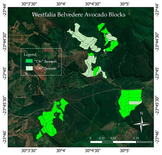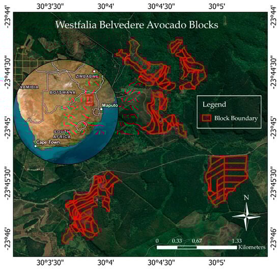 This study was conducted in the Belvedere avocado orchards section of Westfalia Fruit Estates (Pty) Ltd., located in Tzaneen, which is a prominent agricultural region in the Limpopo Province of South Africa (Figure 1). The predominant avocado variety cultivated in the orchards is Hass. However, to enhance cross-pollination and ensure consistent fruit set, additional varieties such as Fuerte and Ryan are also planted in selected rows or sections within some orchard blocks. Geographically, the area lies approximately between latitudes 23.70° S and 23.78° S and longitudes 30.05° E and 30.10° E. Tzaneen is known for its favorable humid subtropical climate conditions for subtropical crops, particularly avocado and citrus, due to its fertile soils, adequate rainfall, and suitable climate [4,49].